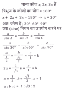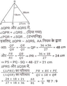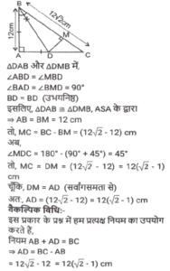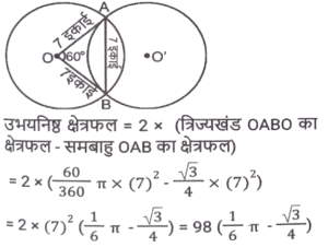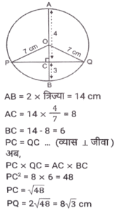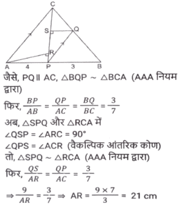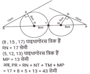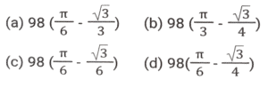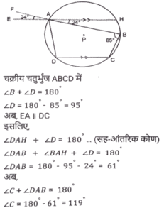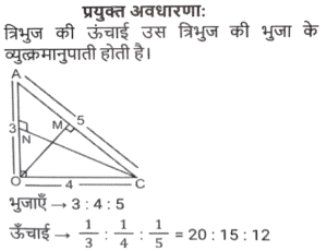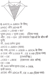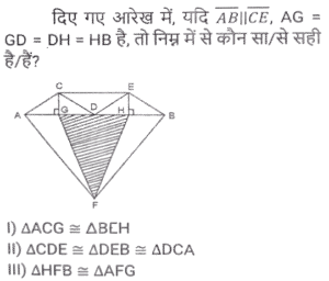 ज्यामितिTotal Questions: 5011. त्रिभुज PQR में, RS, PQ को बिंदु ऽ पर प्रतिच्छेदित करती है। त्रिभुज की भुजाएं QR = 36 cm, SQ = 27 cm, RS = 18 cm हैं और ∠QRS = ∠QPR है। △PRS के परिमाप और △QSR के परिमाप का अनुपात कितना है?(a) 5/8(b) 7/9(c) 8/6(d) 9/12Correct Answer: (b) 7/9Solution:12. निम्न में से कौन सा/से सही है/हैं? [SSC CHSL 09/07/2024 (4th Shift)](a) I, II और III(b)। और ।।।(c) केवल ।(d) । और ।।Correct Answer: (d) । और ।।Solution:13. ABC एक समकोण त्रिभुज है, जो A पर इस प्रकार समकोण है कि AB = AC तथा कोण B का समद्विभाजक भुजा AC को D पर प्रतिच्छेद करता हैं। DM, BC के लंबवत है, जो M पर BC को प्रतिच्छेद करता है। यदि AB = 12 cm तथा BC = 12√2 cm है, तो भुजा AD की लंबाई ज्ञात कीजिए। [SSC CHSL 08/07/2024 (2nd Shift)](a) 12 (√2 + 2) cm(b) 12(√2 - 1) cm(c) 12(√2 - 2) cm(d) 12(√2 + 1) cmCorrect Answer: (b) 12(√2 - 1) cmSolution:14. M और N केंद्र वाले दो वृत्तों की त्रिज्याएँ क्रमशः 5 सेमी और 8 सेमी हैं। वृत्त बिंदु T पर एक दूसरे को बाह्य रूप से स्पर्श करते हैं। एक रेखा PR इस प्रकार खींची जाती है कि बिंदु M, T और N, PR पर स्थित हों, और P, M के निकट हो। P से, केंद्र M वाले वृत्त पर, एक स्पर्श रेखा PQ = 12 सेमी खींची जाती है, जो Q पर स्पर्श करती है, और R से, केंद्र N वाले वृत्त पर, एक अन्य स्पर्श रेखा RS = 15 सेमी खींची जाती है, जो S पर स्पर्श करती है। PR की लंबाई (सेमी में) कितनी है? [SSC CHSL 04/07/2024 (3rd Shift)](a) 53(b) 43(c) 26(d) 37Correct Answer: (b) 43Solution:15. प्रत्येक 7 इकाई त्रिज्या वाले दो वृत्त इस प्रकार प्रतिच्छेद करते हैं कि उभयनिष्ठ जीवा की लंबाई 7 इकाई हो। प्रतिच्छेदन का वर्ग इकाइयों में उभयनिष्ठ क्षेत्रफल क्या होगा ? [SSC CHSL 01/07/2024 (4th Shift)](a)(b)(c)(d)Correct Answer: (d)Solution:16. एक वृत में, ABCD एक चक्रीय चतुर्भुज है जिसमें AE को CD के समानांतर खींचा गया है, और BA को F तक बढ़ाया गया है। यदि ∠ABC = 85° और ∠FAE = 24° हो, तो ∠BCD का मान ज्ञात करें। [SSC CHSL 01/07/2024 (2nd Shift)](a) 119°(b) 124°(c) 115°(d) 125°Correct Answer: (a) 119°Solution:17. 7 cm त्रिज्या वाले एक वृत्त में जीवा PQ की लंबाई (cm में) कितनी है, जहाँ व्यास AB और गैर-व्यासी जीवा PQ, बिंदु C पर लंबवत रूप से प्रतिच्छेद करती है, और AC तथा BC का अनुपात 4:3 है? [SSC CPO 28/06/2024 (2nd Shift)](a) 4√3(b) 8√3(c) 2√3(d) 6√3Correct Answer: (b) 8√3Solution:18. एक त्रिभुज के कोणों का अनुपात 1 : 2 : 3 है, तो संगत भुजाओं का अनुपात ज्ञात कीजिए। [SSC CPO 28/06/2024 (1st Shift)](a) 1: 2 : √3(b) 1 : 2 : 3(c) 1 : √2 : 3(d) 1 : √3 : 2Correct Answer: (d) 1 : √3 : 2Solution:19. ∆ABC में, AB पर एक बिंदु P इस प्रकार है कि PB : AP = 3 : 4 है और PQ, AC के समांतर है। यदि AR QS, PC के लंबवत हैं और QS = 9 cm है, तो AR की लंबाई (cm में) कितनी है? [SSC CPO 27/06/2024 (1st Shift)](a) 28(b) 35(c) 21(d) 14Correct Answer: (c) 21Solution:20. एक त्रिभुज की तीन भुजाओं की लंबाई 3 cm, 4 cm और 5 cm है। उनके संगत शीर्षलंबों और विपरीत शीर्षों का अनुपात क्या होगा ? [Graduate Level 26/06/2024 (Shift - 3)](a) 3 : 4 : 5(b) 9 : 8 : 7(c) 20 : 15 : 12(d) 5 : 4 : 3Correct Answer: (c) 20 : 15 : 12Solution:Submit Quiz« Previous12345Next »