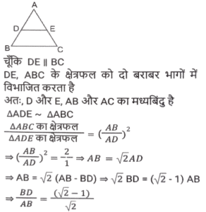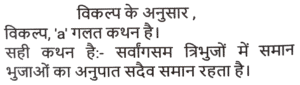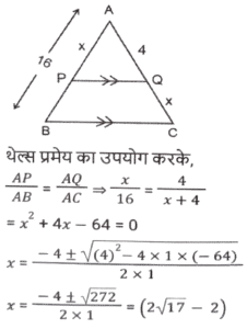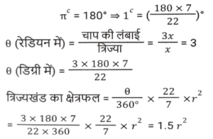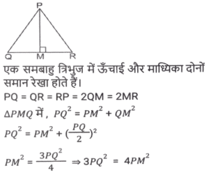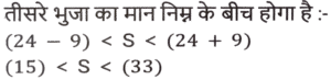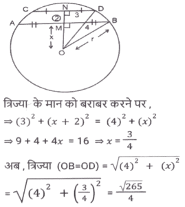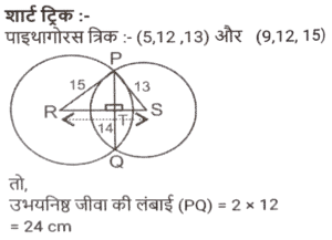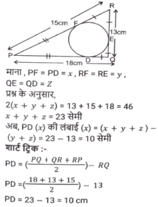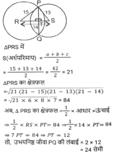 ज्यामितिTotal Questions: 5031. एक त्रिभुज PQR की तीन भुजाओं की माप समान हैं और यदि PM, QR के लंबवत है, तो निम्नलिखित में से कौन-सी समिका सही संबंध दर्शाती है? [SSC CHSL 04/08/2023 (2nd Shift)](a) 3PM² = 2PQ2(b) 3PQ² = 4PM²(c) 3PM² = 4PQ2(d) 3PQ² = 2PM²Correct Answer: (b) 3PQ² = 4PM²Solution:32. AB = 8 cm और CD = 6 cm एक वृत्त के केंद्र की ही दिशा में दो समांतर जीवाएँ हैं। यदि उनके बीच की दूरी 2 cm है, तो वृत्त की त्रिज्या (cm में) कितनी है? [SSC CHSL 02/08/2023 (4th Shift)](a) √265/4(b) √256/ 4(c) √156/4(d) √198/4Correct Answer: (a) √265/4Solution:33. यदि दो वृत्तों के केन्द्रों के बीच की दूरी 12 cm है और त्रिज्याएँ 5 cm और 4 cm हैं, तो अनुप्रस्थ उभयनिष्ठ स्पर्शरखा की लंबाई (cm में) क्या है? [SSC CHSL 02/08/2023 (2nd Shift)](a) 9(b) √143(c) √63(d) 7Correct Answer: (c) √63Solution:34. ∆ABC में, भुजा BC के समानांतर सीधी रेखा AB और AC से क्रमशः बिंदु P और Q पर मिलती है। यदि AP = QC है, AB की लंबाई 16 cm है और AQ की लंबाई 4 cm है, तो CQ की लंबाई (cm में) कितनी है? [SSC CHSL 02/08/2023 (2nd Shift)](a) (2√21 + 2)(b) (2√18 - 2)(c) (2√17 - 2)(d) (2√19 + 2)Correct Answer: (c) (2√17 - 2)Solution:35. एक त्रिभुज की तीन भुजाएं 9, 24 और S इकाई हैं। निम्नलिखित में से कौन-सा सही है ? [SSC CHSL 02/08/2023 (1st Shift)](a)(b)(c)(d)Correct Answer: (a)Solution:36. यदि △ABC और △DEF सर्वांगसम त्रिभुज हैं, तो निम्नलिखित में से कौन-सा असत्य है ? [SSC CGL 24/07/2023 (3rd shift)](a) AC और DF का अनुपात 2:1 है।(b) दोनों त्रिभुजों का परिमाप बराबर है।(c) AB = DE, और BC = EF(d) दोनों त्रिभुजों में कोणों का अनुपात समान है।Correct Answer: (a) AC और DF का अनुपात 2:1 है।Solution:37. 15 cm और 13 cm त्रिज्या वाले दो वृत्तों की उभयनिष्ठ जीवा की लंबाई कितनी होगी, जिनके केंद्र के बीच की दूरी 14 cm है ? [SSC CGL 24/07/2023 (2nd shift)](a) 14 cm(b) 12 cm(c) 15 cm(d) 24 cmCorrect Answer: (d) 24 cmSolution:38. दी गई आकृति में, एक वृत APQR में इस प्रकार उत्कीर्णित है कि वह क्रमशः बिंदु D, E, F पर भुजाओं PQ QR और RP को स्पर्श करता है। यदि भुजाओं की लंबाई PQ = 18 cm, QR = 13 cm और RP = 15 cm है, तो PD की लंबाई ज्ञात कीजिए । [SSC CGL 21/07/2023 (1st shift)](a) 10 cm(b) 8 cm(c) 15 cm(d) 12 cmCorrect Answer: (a) 10 cmSolution:39. एक △ABC में, DE || BC, जहाँ D, AB पर एक बिंदु है और E, AC पर एक बिंदु है। यदि DE, △ABC के क्षेत्रफल को दो बराबर भागों में विभाजित करता है, तो DB: AB निम्न में से किसके बराबर है? [SSC CGL 20/07/2023 (4th shift)](a) √2 : √3(b) √2 : √2 +1(c) √2+1 : √2(d) √2 - 1 : √2Correct Answer: (d) √2 - 1 : √2Solution:40. दी गई आकृति में, चाप AB की लंबाई वृत्त की त्रिज्या के 3 गुना के बराबर है। त्रिज्या r के संदर्भ में त्रिज्यखंड OAB का क्षेत्रफल ज्ञात करें। [SSC CGL 20/07/2023 (1st shift)](a) 1.5 r²(b) 2.5 r²(c) 1/2 r²(d) 3 r²Correct Answer: (a) 1.5 r²Solution:Submit Quiz« Previous12345Next »