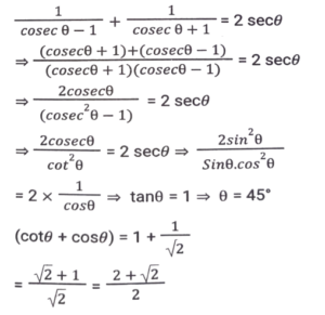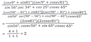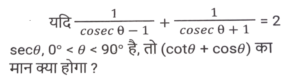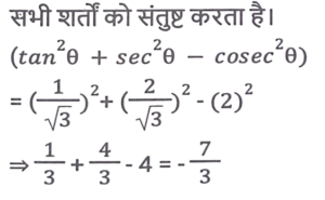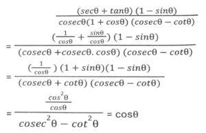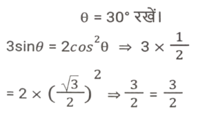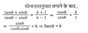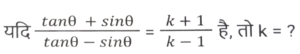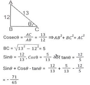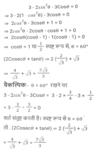 त्रिकोणमिति (भाग-II)Total Questions: 5011. यदि 3 - 2sin²θ - 3Cosθ = 0, 0⁰ < θ < 90⁰, है, तो (2Cosecθ + tanθ) का मान क्या होगा ? [SSC CHSL 02/07/2019 (Evening) ](a) 7√3(b) 5√3(c) 5√3(d) 7√3/3Correct Answer: (d) 7√3/3Solution:12. सरलीकृत मान ज्ञात करें। [SSC CHSL 02/07/2019 (Evening)](a) Cosθ(b) 2Sinθ(c) Sinθ(d) 2CosθCorrect Answer: (d) 2CosθSolution:13. मान ज्ञात करें। [SSC CHSL 02/07/2019 (Evening)](a) 1/2(b) 4(c) 2(d) 1Correct Answer: (c) 2Solution:14. इसका मान किसके बराबर है ? [SSC CHSL 02/07/2019 (Morning)](a) Sinθ(b) Secθ(c) Cosθ(d) CosecθCorrect Answer: (c) CosθSolution:15. यदि 3cos² A + 7sin²A = 4 है, तो cot A का मान ज्ञात करें, यदि दिया हुआ है कि A एक न्यून कोण है। [SSC CGL 13/06/2019 (Evening)](a) 1(b) √3(c) √3/2(d) 1/√3Correct Answer: (b) √3Solution:16. यदि Cosecθ = 13/12 है, तो Sinθ + Cosθ - tanθ का मान ज्ञात करें। [SSC CGL 11/06/2019 (Afternoon)](a) 91/65(b) 139/65(c) 71/65(d) - 71/65Correct Answer: (d) - 71/65Solution:17. यदि Sec4θ = Cosec (θ + 20⁰) है, तो θ किसके बराबर है ? [SSC CGL 10/06/2019 (Afternoon)](a) 22⁰(b) 18⁰(c) 14⁰(d) 20⁰Correct Answer: (c) 14⁰Solution:18. यदि 3 sinθ = 2cos²θ, 0⁰ < θ < 90⁰ है, तो (tan²θ + sec²θ - cosec²θ) का मान ज्ञात करें। [SSC CGL 10/06/2019 (Morning)](a) -2(b) - 7/3(c) 7/3(d) 2Correct Answer: (b) - 7/3Solution:19. k का मान ज्ञात करें। [SSC CGL 10/06/2019 (Morning)](a) cosecθ(b) secθ(c) cosθ(d) sinθCorrect Answer: (b) secθSolution:20. इसका मान क्या होगा ? [SSC CGL 07/06/2019 (Evening)](a)(b)(c)(d)Correct Answer: (b)Solution:Submit Quiz« Previous12345Next »