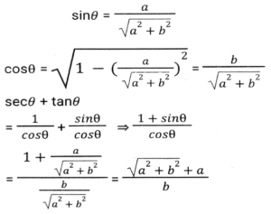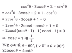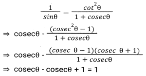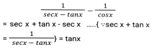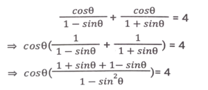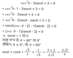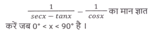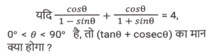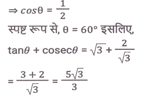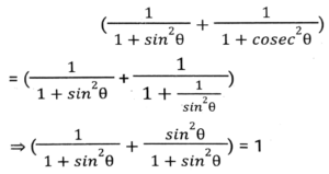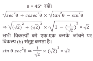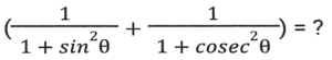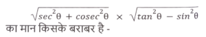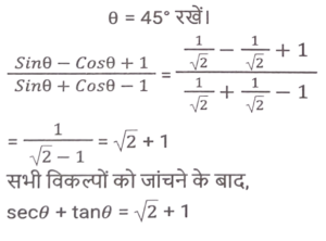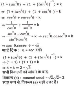 त्रिकोणमिति (भाग-II)Total Questions: 5021. यदि sinθ = a/√a² + b² है और 0⁰ < θ < 90⁰ है, तो secθ + tanθ का मान ज्ञात करें। [SSC CGL 07/06/2019 (Afternoon)](a)(b)(c)(d)Correct Answer: (a)Solution:22. यदि cos²θ - 3cosθ + 2 = sin²θ, 0⁰ < θ < 90⁰ है, तो 2cosecθ + 4cotθ का मान क्या होगा ? [SSC CGL 07/06/2019 (Afternoon)](a)(b)(c)(d)Correct Answer: (a)Solution:23. मान ज्ञात करें [SSC CGL 07/06/2019 (Morning)](a) 2secx(b) tanx(c) 2cosx(d) cotxCorrect Answer: (b) tanxSolution:24. यदि tan² θ - 3secθ + 3 = 0 है, और 0⁰ < x < 90⁰ है, तो sinθ + cotθ का मान क्या होगा ? [SSC CGL 07/06/2019 (Morning)](a)(b)(c)(d)Correct Answer: (a)Solution:25. यदि (1 + tan²θ) + (1 + (tan²θ)⁻¹) = k है, तो √k =? [SSC CGL 06/06/2019 (Evening)](a) cosecθ. secθ(b) cosecθ. cosθ(c) sinθ. cosθ(d) sinθ. secθCorrect Answer: (a) cosecθ. secθSolution:26. इसका मान क्या है? [SSC CGL 06/06/2019 (Evening)](a) 0(b) 1(c) 2(d) -1Correct Answer: (b) 1Solution:27. इसका मान क्या है? [SSC CGL 06/06/2019 (Evening)](a) sin²θ(b) 1(c) cocec²θ(d) 2Correct Answer: (b) 1Solution:28. इसका मान क्या होगा ? [SSC CGL 06/06/2019 (Morning)](a)(b)(c)(d)Correct Answer: (b)Solution:29. हल कीजिए । [SSC CGL 06/06/2019 (Morning)](a) secθ sinθ(b) secθ tanθ(c) secθ + tanθ(d) secθ - tanθCorrect Answer: (c) secθ + tanθSolution:30. इसका मान किसके बराबर है । [SSC CGL 06/06/2019 (Morning)](a) cosecθ sec²θ(b) sinθ sec²θ(c) sinθ cos²θ(d) cosecθ cos²θCorrect Answer: (b) sinθ sec²θSolution:Submit Quiz« Previous12345Next »