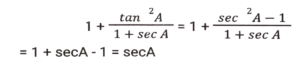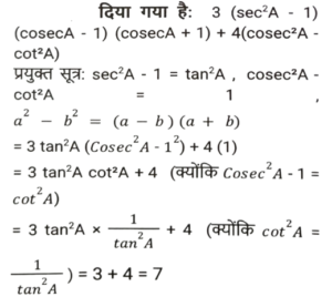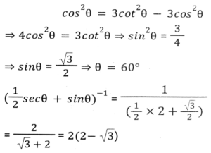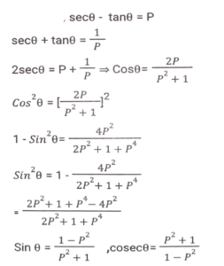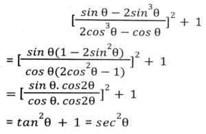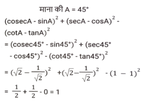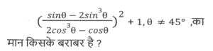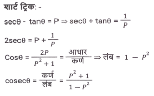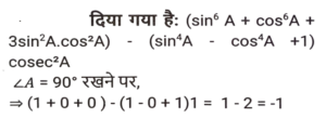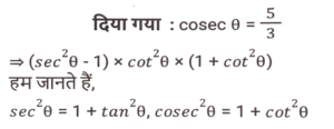 त्रिकोणमिति (भाग-II)Total Questions: 5031. यदि secθ - tanθ = P है, तो cosecθ = ? [SSC CGL 04/06/2019 (Evening)](a)(b)(c)(d)Correct Answer: (c)Solution:32. यदि 0° < θ < 90° और cos²θ = 3(cot²θ - cos²θ ) है, तो (1/2 secθ + sinθ)⁻¹ का मान क्या होगा ? [SSC CGL 04/06/2019 (Afternoon)](a) √3 + 2(b) 2(2 - √3)(c) 2(√3 - 1)(d) √3 + 1Correct Answer: (b) 2(2 - √3)Solution:33. इसका मान किसके बराबर है । [SSC CGL 04/06/2019 (Afternoon)](a) cosec²θ(b) sec²θ(c) cot²θ(d) 2tan²θCorrect Answer: (b) sec²θSolution:34. (cosecA - sinA)² + (secA - cosA)² - (cotA - tanA)² का मान किसके बराबर है । [SSC CPO 16/03/2019 (Evening)](a) 2(b) 0(c) 1(d) -1Correct Answer: (c) 1Solution:35. इसका मान क्या होगा ? [SSC CPO 15/03/2019 (Evening)](a) cosec A(b) cos A(c) sec A(d) sin ACorrect Answer: (c) sec ASolution:36. (sin⁶ A + cos⁶ A + 3sin²A. cos²A) - (sin⁴A - cos⁴A + 1) cosec²A का मान ज्ञात कीजिए। [SSC CHSL Tier II (18/11/2024)](a) 3(b) -3(c) 0(d) -1Correct Answer: (d) -1Solution:37. 3 (sec²A - 1) (cosecA - 1) (cosecA + 1) + 4(cosec²A - cot²A) का मान ज्ञात कीजिए। [SSC CHSL Tier II (18/11/2024)](a) 12(b) 3(c) 10(d) 7Correct Answer: (d) 7Solution:38. sin²30⁰ - sin²40⁰ + sin²45⁰ - sin²55⁰ - sin²35⁰ + sin²45⁰ - sin²50⁰ + sin²60⁰ का मान ज्ञात कीजिए। [SSC CGL 09/09/2024 (1st Shift)](a) 1(b) 2(c) 4(d) 0Correct Answer: (d) 0Solution:39. cos²29⁰ + cos²61⁰ का मान ज्ञात कीजिए। [SSC CGL 09/09/2024 (1st Shift)](a) √3/2(b) 2(c) 1(d) 0Correct Answer: (c) 1Solution:40. यदि cosec θ = 5/3 है, तो (sec² θ -1) × cot² θ × (1+ cot² θ) का मान ज्ञात कीजिए । [SSC CGL 09/09/2024 (1st Shift)](a) 25/16(b) 9/16(c) 25/9(d) 4/5Correct Answer: (c) 25/9Solution:Submit Quiz« Previous12345Next »