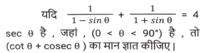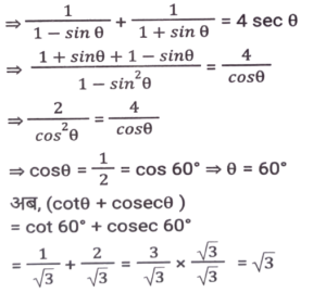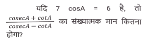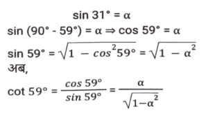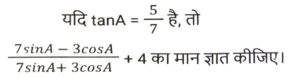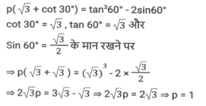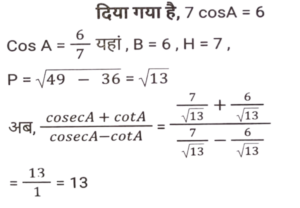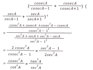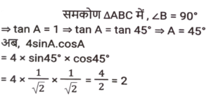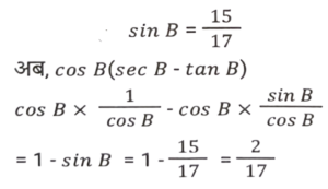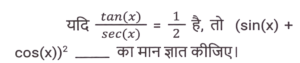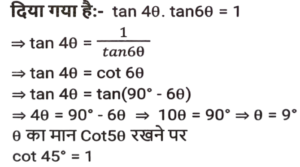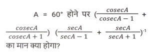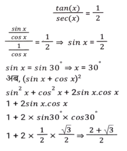 त्रिकोणमिति (भाग-III)Total Questions: 5011. यदि tan4θ. tan6θ = 1 है, जहाँ 6θ एक न्यूनकोण है, तो Cot5θ का मान ज्ञात कीजिए। [SSC CGL 12/09/2024 (3rd Shift)](a) √3(b) -√3(c) -1(d) 1Correct Answer: (d) 1Solution:12. संख्यात्मक मान कितना होगा? [SSC CGL 12/09/2024 (3rd Shift)](a) 1(b) 0(c) 13(d) -13Correct Answer: (c) 13Solution:13. यदि p(√3 + cot 30ᵒ) = tan³60ᵒ - 2sin60ᵒ है, तो P का मान ज्ञात करें [SSC CGL 13/09/2024 (1st Shift)](a) -1(b) 2√3(c) 1(d) √3Correct Answer: (c) 1Solution:14. मान ज्ञात कीजिए। [SSC CGL 13/09/2024 (1st Shift)](a) √3(b) √6(c) √2(d) √5Correct Answer: (a) √3Solution:15. यदि sin 31ᵒ = ∝ है, तो cot 59° का मान ज्ञात कीजिए। [SSC CGL 13/09/2024 (1st Shift)](a)(b)(c)(d)Correct Answer: (b)Solution:16. मान ज्ञात कीजिए। [SSC CGL 13/09/2024 (2nd Shift)](a)(b)(c)(d)Correct Answer: (b)Solution:17. मान ज्ञात कीजिए। [SSC CGL 13/09/2024 (2nd Shift)](a)(b)(c)(d)Correct Answer: (a)Solution:18. यदि sinB = 15/17 है, तो cosB (sec B - tan B) का मान कितना होगा? दिया गया है कि 0 < B < π/2 है [SSC CGL 13/09/2024 (2nd Shift)](a) 1/16(b) 2/15(c) 8/15(d) 2/17Correct Answer: (d) 2/17Solution:19. मान क्या होगा? [SSC CGL 13/09/2024 (3rd Shift)](a) 4(b) 3(c) 1(d) 2Correct Answer: (b) 3Solution:20. एक समकोण △ ABC में ∠B = 90° है, यदि tanA = 1 है, तो 4 sinA cos A = __________ होगा। [SSC CGL 17/09/2024 (1st Shift)](a) 1(b) 2(c) 1/2(d) 4Correct Answer: (b) 2Solution:Submit Quiz« Previous12345Next »