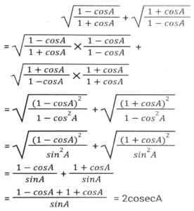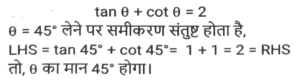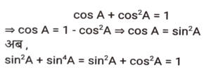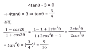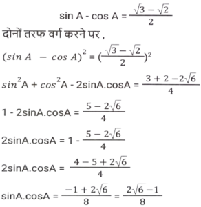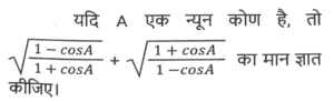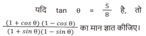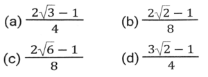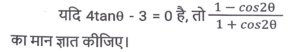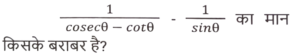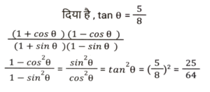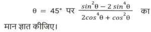 त्रिकोणमिति (भाग-III)Total Questions: 5041. मान ज्ञात कीजिए। [SSC CGL 19/09/2024 (3rd Shift)](a) 5/64(b) 2/25(c) 25/64(d) 64/25Correct Answer: (c) 25/64Solution:42. यदि tan θ + cot θ = 2 और कोई न्यून कोण हो, तो θ का मान ज्ञात कीजिए। [SSC CGL 19/09/2024 (3rd Shift)](a) 30ᵒ(b) 15ᵒ(c) 60ᵒ(d) 45ᵒCorrect Answer: (d) 45ᵒSolution:43. मान ज्ञात कीजिए। [SSC CGL 19/09/024 (1st Shift)](a) 2 cosecA(b) 2 coA(c) 2 secA(d) 2 sinACorrect Answer: (a) 2 cosecASolution:44. यदि √3 cosθ + sinθ = 1 (1 ≤ θ ≤ 90ᵒ) हो, तो θ का मान ज्ञात कीजिए। [SSC CGL 23/09/024 (1st Shift)](a) 20ᵒ(b) 60ᵒ(c) 90ᵒ(d) 30ᵒCorrect Answer: (c) 90ᵒSolution:45. मान लें कि x = r cos (t), y = r sin (t) cos (u), z = r sin (t) sin (u) है। तो x² + y² + z² का मान ज्ञात करें। [SSC CGL 23/09/2024 (1st Shift)](a) r² cos (u)(b) r²(c) 2r(d) r² sin (t)Correct Answer: (b) r²Solution:46. मान ज्ञात कीजिए। [SSC CGL 23/09/2024 (1st Shift)](a) 1(b) 7/15(c) 4/3(d) 9/16Correct Answer: (d) 9/16Solution:47. यदि sin A - cos A √3 - √2 / 2 हो, तो sin A. cos A का मान ज्ञात कीजिए। [SSC CGL 23/09/2024 (2nd Shift)](a)(b)(c)(d)Correct Answer: (c)Solution:48. यदि cosA + cos²A = 1 है, तो sin²A + sin⁴A किसके बराबर है? [SSC CGL 23/09/2024 (2nd Shift)](a)(b)(c)(d)Correct Answer: (d)Solution:49. मान किसके बराबर है? [SSC CGL 23/09/2024 (2nd Shift)](a) tanθ(b) cosecθ(c) cotθ(d) secθCorrect Answer: (c) cotθSolution:50. मान ज्ञात कीजिए। [SSC CGL 23/09/2024 (3rd Shift)](a) 1(b) 0(c) 3(d) 2Correct Answer: (b) 0Solution:Submit Quiz« Previous12345