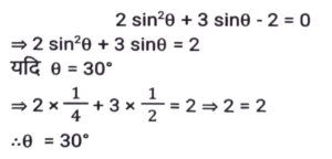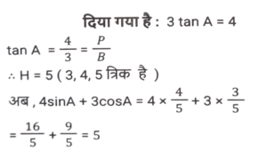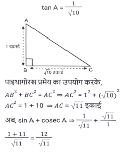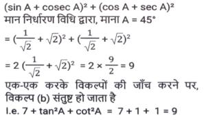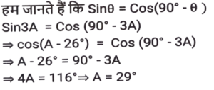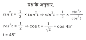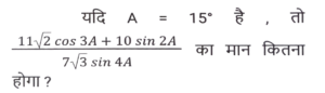 त्रिकोणमिति (भाग-IV)Total Questions: 501. t के किस मान के लिए sin² (t) का मान, tan (t) के मान का आधा है? [SSC CGL 23/09/02024 (3rd Shift)](a) 60ᵒ(b) 45ᵒ(c) 30ᵒ(d) 22.5Correct Answer: (b) 45ᵒSolution:2. यदि tanA = 1/√10 है, A एक न्यून कोण है, तो sinA + cosecA का मान कितना होगा? [SSC CGL 23/09/2024 (3rd Shift)](a) 11√10(b) 1√10(c) 12√11(d) 10√11Correct Answer: (c) 12√11Solution:3. यदि Sec θ = √2 है, तो cosecθ का मान कितना होगा? [SSC CGL 24/09/2024 (1st Shift)](a) 0(b) √2(c) -1(d) 1Correct Answer: (b) √24. यदि 2 sin²θ + 3 sinθ - 2 = 0, (0 ≤ θ ≤ 90ᵒ) है, तो θ का मान कितना होगा ? [SSC CGL 24/09/2024 (1st Shift)](a) 15ᵒ(b) 30ᵒ(c) 60ᵒ(d) 45ᵒCorrect Answer: (b) 30ᵒSolution:5. यदि sin 3A = cos(A - 26ᵒ) है, तो A = __________ होगा, जहां 3A न्यून कोण है। [SSC CGL 24/09/2024 (1st Shift)](a) 29ᵒ(b) 52ᵒ(c) 26ᵒ(d) 78ᵒCorrect Answer: (a) 29ᵒSolution:6. (sinA + cosecA)² + (cosA + secA)² का मान ज्ञात कीजिए। [SSC CGL 24/09/2024 (2nd Shift)](a) 3 + tan²A + cot²A(b) 7 + tan²A + cot²A(c) 5 + tan²A + cot²A(d) 1 + tan²A + cot²ACorrect Answer: (b) 7 + tan²A + cot²ASolution:7. यदि 3 tan A = 4 है और A एक न्यून कोण है, तो 4sinA + 3cosA का मान ज्ञात कीजिए। [SSC CGL 24/09/2024 (2nd Shift)](a) 1(b) 3(c) 4(d) 5Correct Answer: (d) 5Solution:8. यदि 10 sin²θ + 6 cos² θ = 7, 0 < θ < 90ᵒ है, तो tan θ का मान ज्ञात कीजिए। [SSC CGL 24/09/2024 (3rd Shift)](a) √3(b) 1(c) 1/√3(d) 1/2Correct Answer: (c) 1/√3Solution:9. मान कितना होगा ? [SSC CGL 24/09/2024 (3rd Shift)](a) 11/7(b) 21/32(c) 32/21(d) 7/11Correct Answer: (c) 32/21Solution:10. मान ज्ञात कीजिए। [SSC CGL 25/09/2024 (1st Shift)](a) -1(b) 1(c) 0(d) 2Correct Answer: (b) 1Solution:Submit Quiz12345Next »