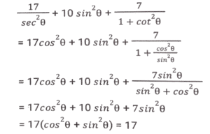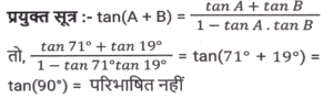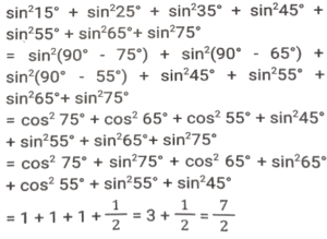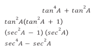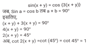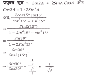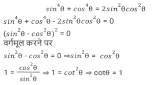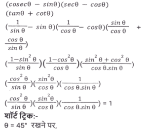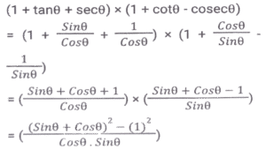त्रिकोणमिति (भाग-V)Total Questions: 5021. यदि sin⁴θ + cos⁴θ = 2sin²θ cos²θ, है, और 0º < θ < 90º है, तो cot θ का मान ज्ञात कीजिए। [SSC CPO 29/06/2024 (1st Shift)](a) 1/2(b) 1/√2(c) 1/3(d) 1Correct Answer: (d) 1Solution:22. tan⁴A + tan²A का मान किसके बराबर है ? [SSC CPO 29/06/2024 (1st Shift)](a) sec²A - sec⁴A(b) -(sec²A + sec⁴A)(c) sec⁴A - sec²A(d) sec⁴A + sec²ACorrect Answer: (c) sec⁴A - sec²ASolution:23. निम्न को हल कीजिए। [SSC CPO 29/06/2024 (1st Shift)](tanθ + secθ + 1) (cotθ - cosecθ + 1) =?(a) 2(b) 1(c) 0(d) -1Correct Answer: (a) 2Solution:24. (cosecθ -sinθ) (secθ - cosθ) (tanθ + cotθ) का मान _________ होगा। [SSC CPO 29/06/2024 (1st Shift)](a) -3(b) 3(c) secθ cosecθ(d) 1Correct Answer: (d) 1Solution:25. निम्नलिखित व्यंजक का मान ज्ञात कीजिए। [SSC CPO 29/06/2024 (2nd Shift)](1 + tanθ + secθ) × (1 + cotθ - cosecθ)(a) 1(b) cosθ sinθ(c) 2(d) tanθCorrect Answer: (c) 2Solution:26. सरल कीजिए। [SSC CPO 29/06/2024 (2nd Shift)](a) निर्धारित नहीं(b) 1(c) √3(d) 0Correct Answer: (a) निर्धारित नहींSolution:27. यदि sin (x+y) = cos{3(x+y)} है, तो cot {2(x+y)} का मान ___________ होगा। [SSC CPO 29/06/2024 (2nd Shift)](a) -1(b) 1(c) -2(d) 2Correct Answer: (b) 1Solution:28. मान ज्ञात कीजिए। [SSC CPO 29/06/2024 (2nd Shift)](a)(b)(c)(d)Correct Answer: (a)Solution:29. हल कीजिए [SSC CPO 29/06/2024 (3rd Shift)](a) 34(b) 20(c) 17(d) 19Correct Answer: (c) 17Solution:30. The value of sin²15º + sin²25º + sin²35º + sin²45º + sin²55º + sin²65º + sin²75º is: [SSC CPO 29/06/2024 (3rd Shift)](a) 4(b) 7(c) 7/2(d) 7/3Correct Answer: (c) 7/2Solution:Submit Quiz« Previous12345Next »