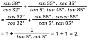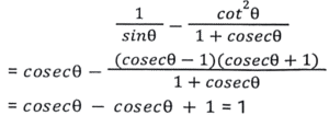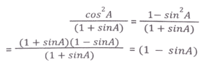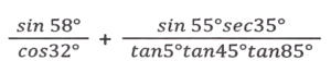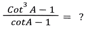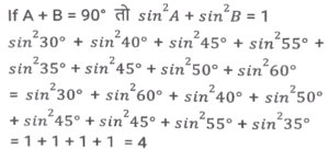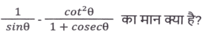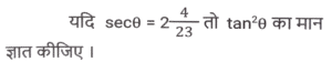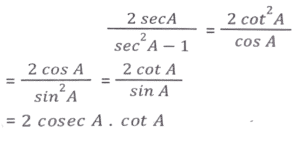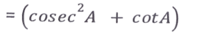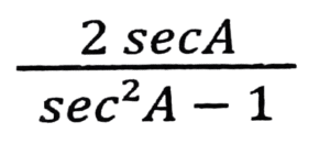 त्रिकोणमिति (भाग-VI)Total Questions: 5031. दिए गए व्यंजक का मान क्या है ? [SSC CHSL 07/08/2023 (3rd Shift)](a) 2 cosec A cot A(b) 2 cos A co tA(c) 2 cosec A tan A(d) 2 cos A sin ACorrect Answer: (a) 2 cosec A cot ASolution:32. दिया गया व्यंजक ____________ के बराबर है। [SSC CHSL 07/08/2023 (3rd Shift)](a) 1 - sinA(b) 1 + cosA(c) SinA(d) CosACorrect Answer: (a) 1 - sinASolution:33. sin²30º + sin²40º + sin²45º + sin²55º + sin²35º + sin²45º + sin²50º + sin²60º का मान ज्ञात कीजिए। [SSC CHSL 07/08/2023 (3rd Shift)](a) 2(b) 4(c) 3(d) 1Correct Answer: (b) 4Solution:34. दिए गए व्यंजक को सरल कीजिए। [SSC CHSL 07/08/2023 (4th Shift)](a) 2(b) -1(c) 3(d) 1Correct Answer: (a) 2Solution:35. हल कीजिए । [SSC CHSL 07/08/2023 (4th Shift)](a) 2(b) 1(c) -1(d) 0Correct Answer: (b) 1Solution:36. मान _____________ के बराबर है। [SSC CHSL 07/08/2023 (4th Shift)](a) 2(b) 1(c) 0(d) 3Correct Answer: (a) 2Solution:37. मान ज्ञात कीजिए । [SSC CHSL 08/08/2023 (1st Shift)](a)(b)(c)(d)Correct Answer: (c)Solution:38. मान ज्ञात कीजिए । [SSC CHSL 08/08/2023 (1st Shift)](a) 1/2(b) 1(c) -1(d) 0Correct Answer: (d) 0Solution:39. दिए गए समीकरण को सरल कीजिए। [SSC CHSL 08/08/2023 (2nd Shift)](a) cosec²A - cotA(b) cosec²A + cotA(c) cot²A + cosecA(d) cot²A - cosecACorrect Answer: (b) cosec²A + cotASolution:40. यदि Tanθ + Secθ = a, तो Secθ का मान किसके बराबर होगा? [SSC CHSL 08/08/2023 (2nd Shift)](a)(b)(c)(d)Correct Answer: (d)Solution:Submit Quiz« Previous12345Next »