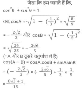 2. दिया गया है कि A और B द्वितीय चतुर्थांश के कोण हैं, sin A = 1/3 और sin B = 1/5 है, तो cos(A - B) का मान ज्ञात कीजिए। [SSC CPO 09/11/2022 (Evening)]