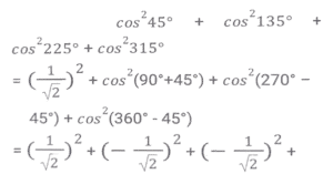 4. व्यंजक cos² 45º + cos² 135º + cos² 225º + cos² 315º का मान क्या है? [SSC CPO 10/11/2022 (Morning)]