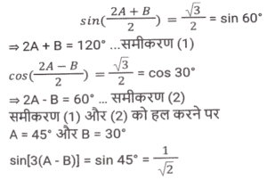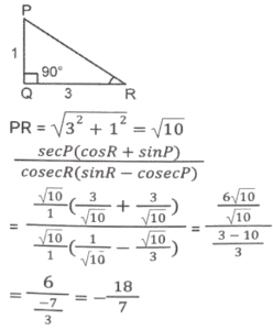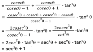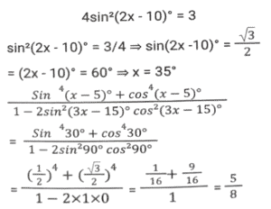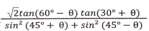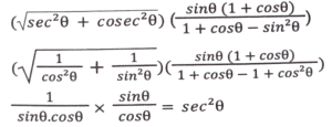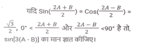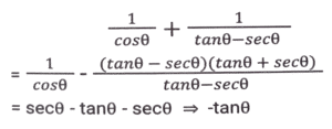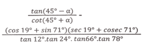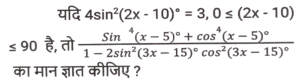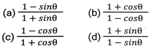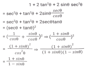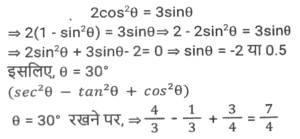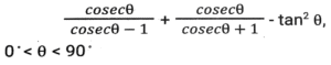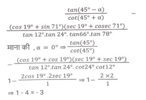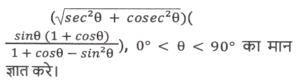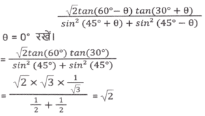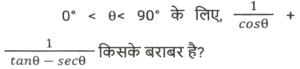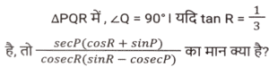 त्रिकोणमिति (भाग-XI)Total Questions: 5711. हल करें [SSC CGL 13/08/2021 (Morning)](a) 2 sec²θ(b) sec²θ + 1(c) sec²θ(d) 1 - tan²θCorrect Answer: (b) sec²θ + 1Solution:12. यदि 2cos²θ = 3sinθ , 0º < θ < 90º, तो (sec²θ - tan²θ + cos²θ) का मान क्या है ? [SSC CGL 13/08/2021 (Afternoon)](a) 7/4(b) 5/4(c) 9/4(d) 3/4Correct Answer: (a) 7/4Solution:13. इसका मान क्या है ? [SSC CGL 13/08/2021 (Evening)](a) -3(b) 0(c) -2(d) 2Correct Answer: (a) -3Solution:14. 1 + 2 tan²θ + 2 sinθ sec²θ, 0º < θ < 90º, के बराबर है ? [SSC CGL 16/08/2021 (Morning)](a)(b)(c)(d)Correct Answer: (d)Solution:15. मान ज्ञात कीजिए। [SSC CGL 16/08/2021 (Evening)](a) 1(b) 1/√2(c) 1/2(d) √3/2Correct Answer: (b) 1/√2Solution:16. मान ज्ञात करे। [SSC CGL 17/08/2021 (Morning)](a) cotθ(b) cosec²θ(c) sec²θ(d) tanθCorrect Answer: (c) sec²θSolution:17. हल करें [SSC CGL 17/08/2021 (Afternoon)](a) -secθ(b) tanθ(c) secθ(d) -tanθCorrect Answer: (d) -tanθSolution:18. मान ज्ञात कीजिए। [SSC CGL 17/08/2021 (Evening)](a) 1(b) 5/8(c) -5/8(d) -1Correct Answer: (b) 5/8Solution:19. मान ज्ञात कीजिए। [SSC CGL 17/08/2021 (Evening)](a) 1/√2(b) 1(c) 2(d) √2Correct Answer: (d) √2Solution:20. इसका मान क्या है ? [SSC CGL 18/08/2021 (Afternoon)](a) -(2/7)(b) 18/7(c) 2/7(d) -(18/7)Correct Answer: (d) -(18/7)Solution:Submit Quiz« Previous123456Next »
