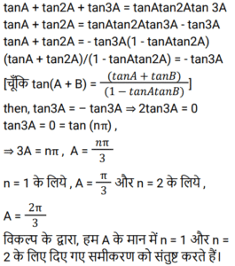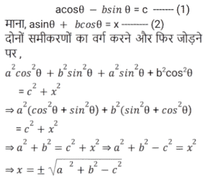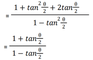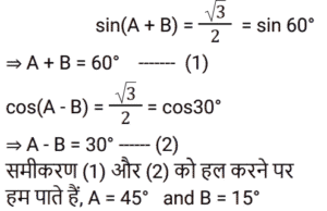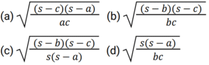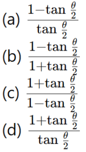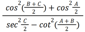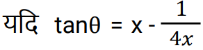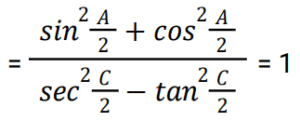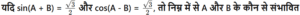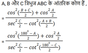 त्रिकोणमितिTotal Questions: 5031. किसी भी त्रिभुज ABC में, a + b + c = 2s सामान्य संकेतक के साथ, तो sin (𝐴/2) ? [NTPC CBT - I 07/01/2021 (Evening)](a)(b)(c)(d)Correct Answer: (b)Solution:32. समीकरण के लिए A का मान ज्ञात कीजिये? [NTPC CBT - I 07/01/2021 (Evening)]tanA + tan2A + tan3A = tanA tan2A tan3A (a)(b)(c)(d)Correct Answer: (b)Solution:33. यदि A, B और C, Δ ABC के आंतरिक कोण हैं, तो निम्न को सरलीकृत कीजिये। [NTPC CBT - I 10/01/2021 (Morning)](a) 1 (b) 2 (c) 0 (d) परिभाषित नहीं हैCorrect Answer: (a) 1 Solution:34. यदि x = r sinA cosC, y = r sinA sinC, और z = r cosA, तो 𝑥² + 𝑦² + 𝑧² का मान ज्ञात कीजिए? [NTPC CBT - I 11/01/2021 (Morning)](a) 𝑟²(b) 2r (c) 2r² (d) 0Correct Answer: (a) 𝑟²Solution:35. मान ज्ञात कीजिये? [NTPC CBT - I 12/01/2021 (Morning)](a) A = 10°, B = 45°(b) A = 50°, B = 10°(c) A = 45°, B = 30°(d) A = 45°, B = 15°Correct Answer: (d) A = 45°, B = 15°Solution:36. यदि sin(3x - 20)° = cos(20 - 3y)° तो x - y का मान ज्ञात कीजिये? [NTPC CBT - I 12/01/2021 (Evening)](a) 20° (b) 60° (c) 30°(d) 45°Correct Answer: (c) 30°Solution:37. यदि acosθ − bsinθ = c तो asinθ + bcosθ का मान ज्ञात कीजिये ? [NTPC CBT - I 16/01/2021 (Morning)](a)(b)(c)(d)Correct Answer: (b)Solution:38. निम्नलिखित व्यंजक का मान क्या है? [NTPC CBT - I 18/01/2021 (Evening)](a)(b)(c)(d)Correct Answer: (c)Solution:39. मान क्या है ? [NTPC CBT - I 18/01/2021 (Evening)](a) 3 + sin²α(b) 3 + 4sin²α(c) 3 - sin²α(d) 3 - 4sin²αCorrect Answer: (d) 3 - 4sin²αSolution:40. तब secθ - tanθ किसके समतुल्य है ? [NTPC CBT - I 19/01/2021 (Morning)] (a)(b)(c)(d)Correct Answer: (d)Solution:Submit Quiz« Previous12345Next »