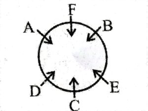 2. छः मित्र, A, B, C, D, E, और F, एक गोल मेज के परितः केन्द्र की ओर अभिमुख होकर और एक दूसरे से समान दूरी पर बैठे हैं। A, C के बाएं से दूसरे स्थान पर बैठा है। D, B के सामने बैठा है। F, B के ठीक दाएं बैठा है। E के दाएं से दूसरे स्थान पर कौन बैठा है?