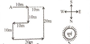 अतः दिशा आरेख से स्पष्ट है कि A अपने शुरूआती बिन्दु से 20 m पूर्व दिशा में है।