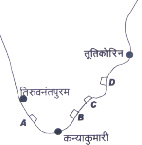 नाभिकीयTotal Questions: 2121. दिए गए चित्र में दक्षिणी भारत का एक भाग दिखाया गया है। दो 1000 मेगावॉट परमाणु शक्ति संयंत्रों के निर्माण के लिए प्रस्तावित स्थल (कुडनकुलम) मानचित्र में चिह्नांकित किया गया है- [I.A.S. (Pre) 1999](a) A से(b) B से(c) C से(d) D सेCorrect Answer: (b) B सेSolution:कुडनकुलम तमिलनाडु के तिरुनेलवेली जिले के कट्टाबोम्मन नामक स्थल पर अवस्थित है, जो प्रस्तुत चित्र के बिंदु B द्वारा निर्देशित है।Submit Quiz« Previous123
