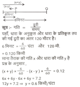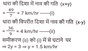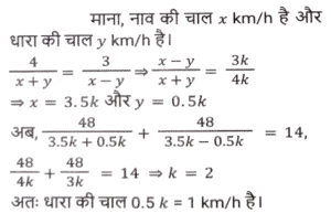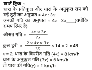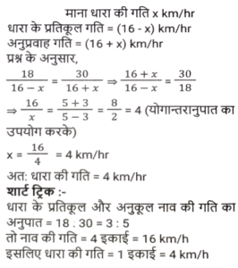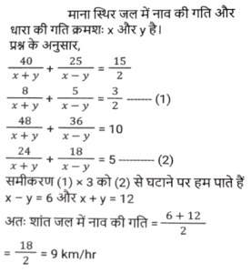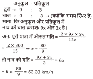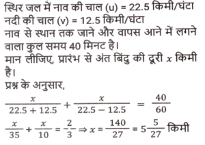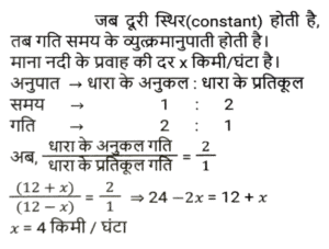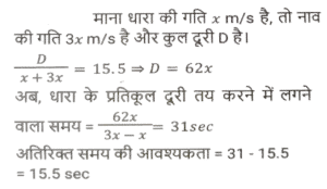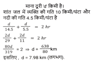 नाव और धारा (Part-II)Total Questions: 2711. रिवर राफ्टिंग के लिए अंकित मनाली गया था। वह शांत जल में 12 km/h की चाल से नाव चलाता है। समान दूरी को धारा के अनुकल तय करने में उसे जितना समय लगता है उसकी तुलना में धारा के प्रतिकूल जाने में उसे दोगुना समय लगता है। नदी के प्रवाह की दर ज्ञात कीजिए। [SSC CHSL 15/03/2023 (3rd Shift)](a) 6 km/h(b) 4 km/h(c) 8 km/h(d) 2 km/hCorrect Answer: (b) 4 km/hSolution:12. एक आदमी शांत जल में 10km/h की चाल से नाव चला सकता है। यदि नदी 4.5 km/h की चाल से बह रही है, तो उसे एक स्थान तक जाने और आरंभिक बिन्दु तक वापस आने में 2 घंटे का समय लगता है। वह स्थान कितनी दूरी (km में) पर स्थित है (दो दशमलव स्थान तक पूर्णांकित) ? [SSC CGL Tier II (02/03/2023)](a) 5.50(b) 8.98(c) 7.98(d) 6.25Correct Answer: (c) 7.98Solution:13. एक तैराक एक बिंदु P से धारा के विपरीत 6 मिनट तक तैरता है और फिर अगले 6 मिनट के लिए धारा के साथ तैरता है और एक बिंदु Q पर पहुँचता है। यदि P और Q के बीच की दूरी 120m है, तो धारा की चाल (km/h में) _________ है। [SSC CGL 01/12/2022 (3rd Shift)](a) 0.4(b) 0.2(c) 1(d) 0.6Correct Answer: (d) 0.6Solution:14. एक बोट रेसर स्थिर जल में 21³⁄₂ किमी/घंटा की चाल से बोट चला सकता है। यदि 12.5 किमी/घंटा की चाल से चलने वाली नदी में, उसे एक स्थान तक जाने और वापस आने में 40 मिनट का समय लगता है, तो वह स्थान कितनी दूर है? [SSC CGL 06/12/2022 (1st Shift)](a) 5⁵⁄₂₇ किमी(b) 5⅖ किमी(c) 4⁵⁄₂₇ किमी(d) 3⁵⁄₂₇ किमीCorrect Answer: (a) 5⁵⁄₂₇ किमीSolution:15. एक आदमी 48 किमी दूर एक स्थान पर नाव चलाकर जाता है और 14 घंटे में वापस आता है। वह पाता है कि वह धारा के साथ 4 km की दूरी तय कर सकता है, जबकि उसी समय में धारा के विपरीत वह 3 km की दूरी तय कर सकता है। धारा की चाल ________ है। [SSC CGL 07/12/2022 (2nd Shift)](a) 1.5 km/h(b) 3.5 km/h(c) 1.8 km/h(d) 1 km/hCorrect Answer: (d) 1 km/hSolution:16. एक नाव 7 घंटे 30 मिनट में 40 किमी धारा की दिशा में और 25 किमी धारा की विपरीत दिशा में जा सकती है। यह 10 घंटे में 48 किमी धारा की दिशा में और 36 किमी धारा की विपरीत दिशा में जा सकती है। शांत जल में नाव की चाल (km/h में) कितनी होगी ? [SSC CPO 09/11/2022 (Evening)](a) 6(b) 12(c) 9(d) 15Correct Answer: (c) 9Solution:17. शांत जल में एक नाव की चाल, धारा की चाल की तीन गुनी है। यदि नाव धारा की दिशा में निश्चित स्थान तक जाने में 15.5 सेकंड का समय लेती है, तो धारा की विपरीत दिशा में यात्रा करते हुए उतनी ही दूरी तय करने के लिए आवश्यक अतिरिक्त समय ज्ञात कीजिए। [SSC CPO 11/11/2022 (Afternoon)](a) 15.5 सेकंड(b) 29 सेकंड(c) 31 सेकंड(d) 35 सेकंडCorrect Answer: (a) 15.5 सेकंडSolution:18. एक व्यक्ति धारा की दिशा में 49 किमी की दूरी 7 घंटे में और धारा की विपरीत दिशा में 36 किमी की दूरी 9 घंटे में तय कर सकता है। धारा की चाल क्या है? [Higher Secondary 02/08/2022 (Shift-2)](a) 1.5 km/h(b) 2 km/h(c) 2.5 km/h(d) 3 km/hCorrect Answer: (a) 1.5 km/hSolution:19. शांत जल में एक नाव की चाल 16 km / h है। नाव द्वारा धारा की विपरीत दिशा में 18 किमी दूरी तय करने में लिया गया समय धारा की दिशा में 30 किमी की यात्रा करने में लिए गए समय के बराबर है। धारा की चाल ज्ञात कीजिए। (km/h) [SSC MTS 06/07/2022 (Evening)](a) 4(b) 7(c) 5(d) 6Correct Answer: (a) 4Solution:20. एक व्यक्ति कुल 15 घंटे के समय में नाव खेते हुए J से K (धारा की विपरीत 
