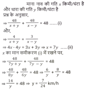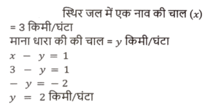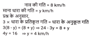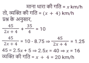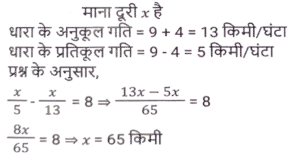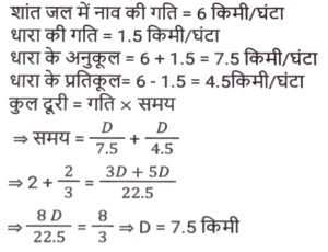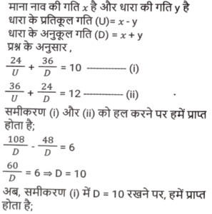 नाव और धाराTotal Questions: 5031. एक नाव की धारा के प्रतिकूल और धारा के अनुकूल जाने की चाल का अनुपात 2: 3 है और इन दोनों चालों का योग 15 km/h है। धारा की चाल क्या है? [SSC CHSL 08/07/2024 (2nd Shift)](a) 3.5 km/h(b) 1.5 km/h(c) 3 km/h(d) 2.5 km/hCorrect Answer: (b) 1.5 km/hSolution:32. एक आदमी स्थिर जल में 8 km/h की चाल से नाव चला सकता है। यदि उसे धारा के प्रतिकूल जाने में धारा के अनुकूल जाने में लगने वाले समय से तीन गुना अधिक समय लगता है। तो धारा की चाल (km/h में) ज्ञात कीजिए। [SSC CHSL 08/07/2024 (4th Shift)](a) 6(c) 5(d) 3(b) 4Correct Answer: (b) 4Solution:33. यदि स्थिर जल में एक नाव की चाल 3 km/h है और यदि धारा के प्रतिकूल इसकी चाल 1 km/h है, तो धारा की चाल ज्ञात कीजिए। [SSC CHSL 11/07/2024 (3rd Shift)](a) 0.25 km/h(b) 1 km/h(c) 2 km/h(d) 0.5 km/hCorrect Answer: (c) 2 km/hSolution:34. एक पुरुष नदी के पानी में 1 km की दूरी तय करना चाहता है। शांत जल में इस दूरी को तय करने में उसे 12 मिनट लेकिन बहती नदी में 13 मिनट लगते हैं। नदी के बहते पानी की चाल ज्ञात करें। [SSC CPO 27/06/2024 (1st Shift)](a) 25 km/h(b) 5/13 km/h(c) 22 km/h(d) 7/12 km/hCorrect Answer: (b) 5/13 km/hSolution:35. शांत जल में एक व्यक्ति की चाल, धारा की चाल से 4 km/h अधिक है। यदि वह व्यक्ति धारा की अनुकूल दिशा में 45 km और धारा की प्रतिकूल दिशा में 35 km की दूरी तय करने में कुल 10 घंटे लेता है, तो शांत जल में व्यक्ति की चाल कितनी है ? [SSC CPO 27/06/2024 (3rd Shift)](a) 20 km/h(b) 18 km/h(c) 15 km/h(d) 22 km/hCorrect Answer: (a) 20 km/hSolution:36. एक नाव धारा के प्रतिकूल 24 km की दूरी और धारा के अनुकूल 36 km की दूरी 10 घंटे में तय करती है, और धारा के प्रतिकूल 36 km की दूरी और धारा के अनुकूल 24 km की दूरी 12 घंटे में तय करती है। धारा की चाल ज्ञात करें। [SSC CPO 28/06/2024 (1st Shift)](a) 26/9 km/h(b) 33/13 km/h(c) 25/8 km/h(d) 24/7 km/hCorrect Answer: (c) 25/8 km/hSolution:37. एक नाव 52 min में धारा के अनुकूल 16.9 km की यात्रा कर सकती है। यदि धारा की गति 3 km/h है, तो नाव को धारा के प्रतिकूल 84 km की दूरी तय करने में कितना समय (घंटों में) लगेगा ? [SSC CPO 29/06/2024 (1st Shift)](a) 6(b) 13.5(c) 6.22(d) 7.5Correct Answer: (c) 6.22Solution:38. एक आदमी 48 km नाव चलाता है और 48 घंटे में वापस आता है। वह धारा के अनुकूल 4 km की दूरी उतने ही समय में तय कर सकता है जितने समय में धारा के विपरीत 3 km की दूरी तय करता है। धारा की चाल (km/h में) ज्ञात करें। [SSC CPO 29/06/2024 (2nd Shift)](a) 5/21(b) 7/21(c) 7/24(d) 3/29Correct Answer: (c) 7/24Solution:39. एक आदमी शांत जल में 9 km/h की चाल से नाव चला सकता है। यदि नदी 4 km/h की चाल से बह रही है, तो समान दूरी के लिए धारा के अनुकूल जाने की तुलना में धारा के प्रतिकूल जाने में 8 घंटे अधिक समय लगता है। स्थान कितना दूर है? [Matriculation Level 24/06/2024 (Shift-1)](a) 65 km(b) 60 km(c) 75 km(d) 55 kmCorrect Answer: (a) 65 kmSolution:40. स्थिर जल में एक नाव की गति 6 km/h है और धारा की गति 1.5 km/h है। बिंदु A से बिंदु B तक जाने और बिंदु A पर लौटने में नाविक को 2 घंटे 40 मिनट लगते हैं। बिंदु A और B के बीच की दूरी ज्ञात कीजिए। [Higher Secondary 24/06/2024 (Shift-2)](a) 7.5 km(b) 8 km(c) 7 km(d) 8.5 kmCorrect Answer: (a) 7.5 kmSolution:Submit Quiz« Previous12345Next »