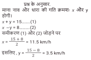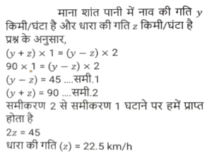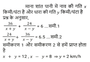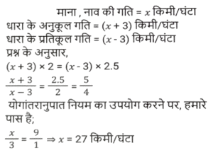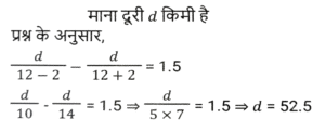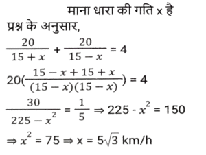 नाव और धाराTotal Questions: 5041. एक नाव धारा के अनुकूल एक निश्चित दूरी 2 घंटे में तय करती है, जबकि वह 2½ घंटे में वापस आती है। यदि धारा की चाल 3 km/h है, तो स्थिर जल में नाव की चाल क्या है? [Graduate Level 24/06/2024 (Shift-3)](a) 25 km/h(b) 29 km/h(c) 27 km/h(d) 20 km/hCorrect Answer: (c) 27 km/hSolution:42. एक मोटरबोट की चाल स्थिर जल में 15 km/h है। उसे धारा की दिशा में 20 km जाने और वहाँ से वापस आने में कुल 4 घंटे लगते हैं। तो धारा की चाल (km/h) क्या है? [Graduate Level 26/06/2024 (Shift-4)](a) 4√3(b) 7√3(c) 6√3(d) 5√3Correct Answer: (d) 5√3Solution:43. एक नाव धारा की प्रतिकूल दिशा में 1 घंटा में 3 km चलती है और धारा की अनुकूल दिशा में 12 मिनट में 1 km चलती है। नाव को स्थिर जल में 6 km जाने में कितना समय लगेगा? [SSC CHSL Tier II 10/01/2024](a) 1 घंटा 25 मिनट(b) 1 घंटा 15 मिनट(c) 1 घंटा 30 मिनट(d) 1 घंटा 20 मिनटCorrect Answer: (c) 1 घंटा 30 मिनटSolution:44. शांत जल में एक नाव की चाल 20 किमी/घंटा है, जबकि नदी की धारा 8 किमी/घंटा की चाल से बह रही है, और धारा के विपरीत दिशा में एक निश्चित दूरी को तय करने में लगा समय, धारा की दिशा में उतनी ही दूरी को तय करने में लगने वाले समय से 6 घंटे अधिक है। दूरी ज्ञात कीजिए। [SSC CPO 03/10/2023 (3rd Shift)](a) 126 km(b) 125 km(c) 120 km(d) 336 kmCorrect Answer: (a) 126 kmSolution:45. शांत जल में एक नाव की चाल 6 km/h है, और धारा की चाल 2.5 km/h है। एक व्यक्ति नाव से 59.5 किलोमीटर की दूरी पर स्थित एक स्थान पर जाता है, और प्रारंभिक बिंदु पर वापस आता है। उसके द्वारा लिया गया कुल समय कितना होगा ? [SSC CPO 04/10/2023 (1st Shift)](a) 22 घंटे(b) 18 घंटे(c) 16 घंटे(d) 24 घंटेCorrect Answer: (d) 24 घंटेSolution:46. धारा की विपरीत दिशा में एक नाव की चाल 8 km/h है, और धारा की दिशा में उस नाव की चाल 15 km/h है। शांत जल में नाव की चाल और धारा की चाल (km/h में) क्रमशः ज्ञात कीजिए। [SSC CPO 04/10/2023 (2nd Shift)](a) 11.5 और 3.5(b) 3.5 और 11.5(c) 3 और 11(d) 11 और 3Correct Answer: (a) 11.5 और 3.5Solution:47. एक नाविक नाव चलाकर 6 घंटे में धारा के अनुकूल 36 km और धारा के प्रतिकूल 24 km की दूरी तय करता है। जब वह धारा के अनुकूल 24 km और धारा के प्रतिकूल 36 km की दूरी तय करता है तो नाविक को साढ़े 6 घंटे का समय लगता है। धारा की चाल कितनी है ? [SSC MTS 01/09/2023 (3rd Shift)](a) 1.5 km/h(b) 4 km/h(c) 3 km/h(d) 2 km/hCorrect Answer: (d) 2 km/hSolution:48. एक नाविक धारा के विपरीत 2 घंटे में 6 km जाता है और धारा की दिशा में 7.5 मिनट में 1.5 km जाता है। स्थिर जल में 30 km जाने में उसे कितना समय (घंटों में) लगेगा? [SSC MTS 04/09/2023 (3rd Shift)](a) 2.5(b) 3.5(c) 3.0(d) 4.0Correct Answer: (d) 4.0Solution:49. एक मोटर नाव स्थिर जल में 12 km/h की चाल से चल सकती है। यदि धारा की चाल 2 km/h है, तो नाव धारा के प्रतिकूल एक दूरी तय करने में धारा के अनुकूल समान दूरी तय करने से 1.5 घंटे अधिक का समय लेती है। एक तरफ की दूरी कितनी है? [SSC MTS 08/09/2023 (3rd Shift)](a) 52.5 km(b) 50 km(c) 51.5 km(d) 53 kmCorrect Answer: (a) 52.5 kmSolution:50. एक नाव द्वारा धारा के प्रतिकूल x km की दूरी तय करने में लिया गया समय उसी नाव द्वारा धारा के अनुकूल समान दूरी तय करने में लिए गए समय का दोगुना है। नाव और धारा की चालों का योग 90 km/h है। धारा की चाल __________ km/h है। [SSC MTS 12/09/2023 (3rd Shift)](a) 22.537.5(c) 27.5(d) 33.5Correct Answer: (a) 22.5Solution:Submit Quiz« Previous12345