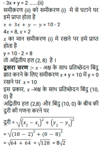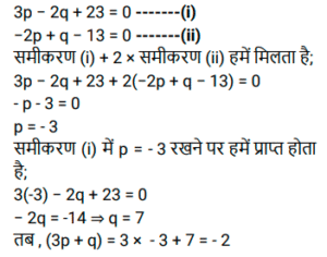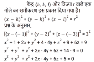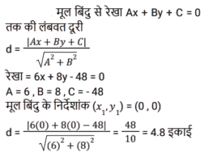 निर्देशांक ज्यामिति (SSC)Total Questions: 3211. दो रैखिक समीकरणों2x + y = 6 और 2x - y = - 2 द्वारा निर्मित उस क्षेत्र का क्षेत्रफल ज्ञात कीजिए जो इन रेखाओं और x-अक्ष से घिरा (bounded) हुआ है ? [SSC CHSL 03/07/2024 (2nd Shift)](a) 8 वर्ग इकाई(b) 5 वर्ग इकाई(c) 3 वर्ग इकाई(d) 6 वर्ग इकाईCorrect Answer: (a) 8 वर्ग इकाईSolution:12. मूल बिंदु से रेखा 6x + 8y - 48 = 0 तक की लंबवत लंबाई ज्ञात कीजिए। [SSC CHSL 05/07/2024 (3rd Shift)](a) 4.8 इकाई(b) 2.6 इकाई(c) 8.3 इकाई(d) 5.2 इकाईCorrect Answer: (a) 4.8 इकाईSolution:13. यदि समीकरण 20𝑥 + 21y = 420 का ग्राफ निर्देशांक अक्षों को P और Q पर काटता है, तो PQ की लंबाई की माप (इकाइयों में) क्या है ? [SSC CHSL 05/07/2024 (4th Shift)](a) 29(b) 35(c) 25(d) 40Correct Answer: (a) 29Solution:14. यदि ग्राफ पर समीकरण 3p − 2q + 23 = 0 और −2p + q − 13 = 0 का प्रतिच्छेदन बिंदु (p, q) है, तो (3p + q) का मान ___ होगा। [SSC CHSL 09/07/2024 (2nd Shift)](a) - 1(b) - 2(c) 2(d) 1Correct Answer: (b) - 2Solution:15. रेखाओं x + y = 10 और -3x + y = 2 का एक अद्वितीय हल है। रेखा x + y = 10 के अद्वितीय हल और प्रतिच्छेदन बिंदु और x-अक्ष के बीच की दूरी (इकाई में) कितनी है ? [SSC CHSL 09/07/2024 (3rd Shift)](a) 10√2(b) 8√2(c) 10(d) 8Correct Answer: (b) 8√2Solution:16. केंद्र (-1, 2, -3) और 3 इकाइयों की त्रिज्या वाले गोले का समीकरण ज्ञात करें। [SSC CHSL 09/07/2024 (3rd Shift)](a) x² + y² + z² + 2x - 4y + 6z + 5 = 0(b) x² + y² + z² - x + 2y - 3z + 5 = 0(c) x² + y² + z² - 2x + 4y - 6z + 5 = 0(d) x² + y² + z² + x - 2y + 3z + 5 = 0Correct Answer: (a) x² + y² + z² + 2x - 4y + 6z + 5 = 0Solution:17. वृत्त 𝑥² + 𝑦² = 25 की त्रिज्या ज्ञात कीजिए I [SSC CHSL 08/08/2023 (4th Shift)](a) 25 इकाई(b) 5 इकाई(c) 2 इकाई(d) 12 इकाईCorrect Answer: (b) 5 इकाईSolution:18. उन बिंदुओं के निर्देशांक ज्ञात कीजिए जिनमे आरेख 57x - 19y = 399 निर्देशांक अक्षों को काटता है। [SSC CGL Tier II (07/03/2023)](a) x- अक्ष पर (-7,0) और y- अक्ष पर (0, -21)(b) x-अक्ष पर (-7,0) और y- अक्ष पर (0,21)(c) x-अक्ष पर (7,0) और y- अक्ष पर (0,-21(d) x-अक्ष पर (7,0) और y -अक्ष पर (0,21)Correct Answer: (c) x-अक्ष पर (7,0) और y- अक्ष पर (0,-21Solution:19. समीकरण x = a (a ≠ 0) का ग्राफ, _________ है। [SSC CGL Tier II (08/08/2022)](a) x अक्ष के समानांतर सरल रेखा(b) y अक्ष के समानांतर रेखा(c) y अक्ष पर 45 डिग्री के कोण पर रेखा(d) x अक्ष पर 45 डिग्री के कोण पर रेखाCorrect Answer: (b) y अक्ष के समानांतर रेखाSolution:20. दिए गए प्रश्न का उत्तर ज्ञात कीजिए ? [SSC CGL Tier II (29/01/2022)](a) 4x − y - 7 = 0(b) x − 3y - 12 = 0(c) 3x − y − 7 = 0(d) x + 2y - 5 = 0Correct Answer: (c) 3x − y − 7 = 0Solution:Submit Quiz« Previous1234Next »
