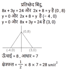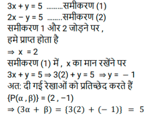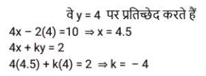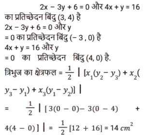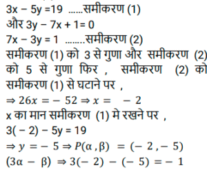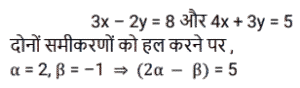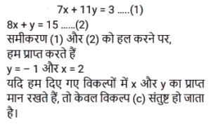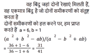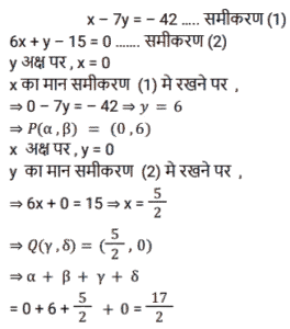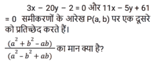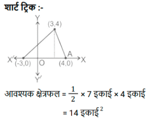 निर्देशांक ज्यामिति (SSC)Total Questions: 3221. समीकरण 2x – 3y + 6 = 0, 4x + y = 16 और y = 0 के बिंदुरेख से परिबंध क्षेत्र का क्षेत्रफल ( इकाई वर्गों में ) कितना होगा ? [SSC CGL Tier II (29/01/2022)](a) 11.5(b) 14(c) 10.5(d) 12Correct Answer: (b) 14Solution:22. समीकरण 7x + 11y = 3 और 8x + y = 15 के आलेख बिंदु P पर प्रतिच्छेद करते हैं, जो समीकरण ______ के आलेख पर भी स्थित है। [SSC CGL Tier II (29/01/2022)](a) 2x + y = 2(b) 2x – y = 1(c) 3x + 5y = 1(d) 3x + 2y = 3Correct Answer: (c) 3x + 5y = 1Solution:23. दिए गए प्रश्न का उत्तर ज्ञात कीजिए ? [SSC CGL Tier II (15/11/2020)](a) 37/35(b) 31/41(c) 5/7(d) 41/31Correct Answer: (b) 31/41Solution:24. समीकरण 8x + 3y = 24, 2x + 8 = y और x-अक्ष के आरेख द्वारा निर्मित त्रिभुज का क्षेत्रफल (वर्गइकाइयों में) है : [SSC CGL Tier II (15/11/2020)](a) 28(b) 14(c) 15(d) 24Correct Answer: (a) 28Solution:25. रैखिक समीकरण 3x – 2y = 8 और 4x + 3y = 5 के आरेख बिंदु(α, β) पर प्रतिच्छेद करता है। (2α − β) का मान क्या है ? [SSC CGL Tier II (16/11/2020)](a) 4(b) 6(c) 3(d) 5Correct Answer: (d) 5Solution:26. रेखा Y = 3 में, बिंदु (5, -3) का प्रतिबिंब क्या है [SSC CGL Tier II (18/11/2020)](a) (5, -6)(b) (-5, 3)(c) (5, 9)(d) (5, 3)Correct Answer: (c) (5, 9)Solution:27. रैखिक समीकरणों 4x – 2y = 10 और 4x + ky = 2 के आरेख एक बिंदु (a, 4) पर एक-दूसरे को काटते हैं। k का मान ज्ञात करे। [SSC CGL Tier II ( 18/11/2020)](a) 3(b) – 3(c) – 4(d) 4Correct Answer: (c) – 4Solution:28. समीकरण 3x + y – 5 = 0 तथा 2x – y – 5 = 0 के आरेख एक बिंदु P (α, β) पर एक-दूसरे को काटते हैं | (3α + β) का मान क्या ह [SSC CGL Tier II (11/09/2019)](a) 4(b) - 4(c) 3(d) 5Correct Answer: (d) 5Solution:29. समीकरण x – 7y = – 42 का आरेख y - अक्ष को P (α , β) पर काटता हैतथा समीकरण 6x + y – 15 = 0 का आरेख x - अक्ष को Q(γ , δ) पर काटता है| α + β + γ + δ का मान क्या है [SSC CGL Tier II (11/09/2019)](a) 17/2(b) 6(c) 9/2(d) 5Correct Answer: (a) 17/2Solution:30. समीकरण 3x – 5y = 19 तथा 3y – 7x + 1= 0 के आरेखों का प्रतिच्छेद बिंदु P(α , β) है | (3α − β) का मान क्या है ? [SSC CGL Tier II (12/09/2019)](a) - 2(b) –1(c) 1(d) 0Correct Answer: (b) –1Solution:Submit Quiz« Previous1234Next »