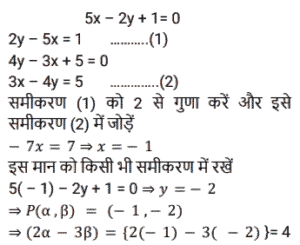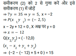 निर्देशांक ज्यामिति (SSC)Total Questions: 3231. समीकरणों 2x + 3y = 11 तथा x – 2y + 12 = 0 के आरेख एक दूसरे को P(𝑥₁, 𝑦₁) पर काटते हैं तथा समीकरण x – 2y + 12 = 0 का आरेख x-अक्ष को Q( 𝑥₂, 𝑦₂) पर काटता है I (𝑥₁ - 𝑥₂ + 𝑦₁ + 𝑦₂) का मान क्या है [SSC CGL Tier II (12/09/2019)](a) 13(b) - 11(c) 15(d) -9Correct Answer: (c) 15Solution:32. समीकरण 5x – 2y + 1 = 0 और 4y – 3x + 5 = 0 के आरेख एक-दूसरे को बिंदु P(α, β) पर काटतेहैं| (2α − 3β) का मान क्या होगा ? [SSC CGL Tier II (13/09/2019)](a) 4(b) 6(c) - 4(d) - 3Correct Answer: (a) 4Solution:Submit Quiz« Previous1234