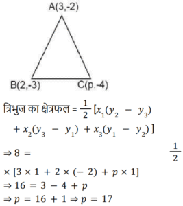 9. (3, -2), (2, 3) और (p, -4) शीघ्र वाले एक त्रिभुज का क्षेत्रफल 8 वर्ग इकाइयाँ है। P का मान ज्ञात कीजिए। [Group D 30/08/2022 (Afternoon)]