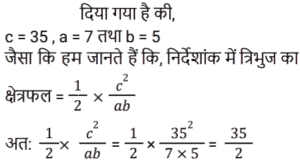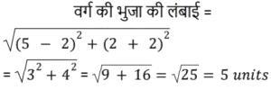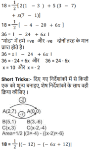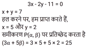 निर्देशांक ज्यामितिTotal Questions: 5711. समीकरण 3x - 2y - 11 = 0 और x + y = 7 के आलेख P (α, β) पर प्रतिबिंब करते हैं। (3α + 5) का मान क्या है? [Level 2 (13/06/2022) Shift 2 ](a) 11(b) 23(c) 25(d) 13Correct Answer: (c) 25Solution:12. एक सरल रेखा kx - 3y = 6, बिंदु (3, 2) से होकर गुजरती है। k का मान ज्ञात कीजिए। [Level 2 (13/06/2022) Shift 2](a) 11(b) 23(c) 25(d) 13Correct Answer: (b) 23Solution:13. दी गई संख्या रेखा पर कौन सा बिंदु 6/5 को दर्शाता है? [RRB NTPC 05/01/2021 (Morning)](a) R(b) W(c) S(d) KCorrect Answer: (a) RSolution:14. यदि (2, 7), (5, 1), (x, 3) एक त्रिभुज के शीघ्र हैं जिसका क्षेत्रफल 18 (वर्ग इकाइयाँ) है, तो x के संभावित मान ज्ञात कीजिए? [RRB NTPC 12/01/2021 (Morning)](a) -10 or -2(b) 10 or -2(c) 10 or 2(d) -10 or 2Correct Answer: (b) 10 or -2Solution:15. वृत्त x² + y² = 9 के बिंदु x = 2 पर खींची गई स्पर्श रेखा के समीकरण ज्ञात कीजिए? [RRB NTPC 19/01/2021 (Morning)](a) -2x + √5y = 9(b) 2x + √5y = 9(c) -2x - √5y = 9(d) 2x - √5y = 9Correct Answer: (b) 2x + √5y = 9Solution:16. दिए गए प्रश्न का उत्तर ज्ञात कीजिए ? [RRB NTPC 21/01/2021 (Morning)](a) 3(b) 1(c) 0(d) 2Correct Answer: (c) 0Solution:17. उस बिंदु के निर्देशांक ज्ञात कीजिए जो बिंदु (2, 4) और (7, 9) को मिलाने वाली रेखा को अंतरिक रूप से 1:2 के अनुपात में विभाजित करेगा? [RRB NTPC 05/02/2021 (Morning)](a)(b)(c)(d)Correct Answer: (b)Solution:18. निर्देशांक अक्ष और सीधी रेखा द्वारा गठित त्रिभुज का वर्ग इकाइयों में क्षेत्रफल 5x + 7y = 35 है? [RRB NTPC 05/02/2021 (Morning)](a) 2/35(b) 35/2(c) 25/2(d) 35Correct Answer: (b) 35/2Solution:19. वृत्त x² + y² - 3x - 4y + 1 = 0 के संदर्भ में बिंदु (3,4) की स्थिति क्या होगी? [RRB NTPC 05/02/2021 (Morning)](a) इसके अंदर नहीं है(b) इसके बाहर स्थित है(c) इसके ऊपर स्थित है(d) निश्चित नहीं किया जा सकताCorrect Answer: (b) इसके बाहर स्थित हैSolution:20. यदि (2, -2) और (5, 2) एक वर्ग के लगातर दो शीर्ष हैं, तो वर्ग की प्रत्याशित भुजा की लंबाई होगी: [RRB NTPC 08/02/2021 (Evening)](a) 5 इक्काई(b) 5√2 इक्काई(c) 55/√2 इक्काई(d) √5 इक्काईCorrect Answer: (a) 5 इक्काईSolution:Submit Quiz« Previous123456Next »
