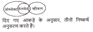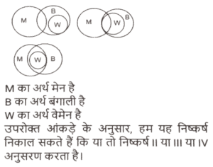 Solution:जैसा कि कथन (3) में दिया गया है कि हर कोई हॉकी या बैडमिंटन खेलता है और कथन (2) में कहा गया है कि कुछ लड़कियां बैडमिंटन नहीं खेलती हैं। इस प्रकार, कुछ लड़कियां निश्चित रूप से हॉकी खेलेंगी। साथ ही, कथनों (1) और (2) में कुछ का उपयोग किया जाता है, जिसका अर्थ है कि कोई भी हॉकी और बैडमिंटन दोनों नहीं खेलता है।