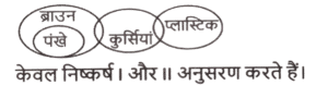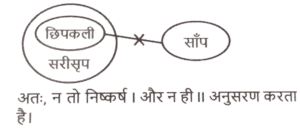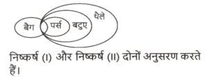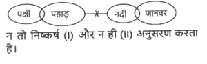 न्यायवाक्य (भाग-II)Total Questions: 5011. दिए गए निष्कर्षों में से कौन सा कथन से तार्किक रूप से अनुसरण करता है। [SSC MTS 12/11/2024 (Morning)]कथन : कोई भी छिपकली, साँप नहीं है। सभी छिपकलियां, सरीसृप हैं। निष्कर्षः (I) कम से कम कुछ सरीसृप, साँप हैं। (II) सभी सरीसृप, छिपकलियां हैं।(a) केवल निष्कर्ष (I) अनुसरण करता है।(b) केवल निष्कर्ष (II) अनुसरण करता है।(c) न तो निष्कर्ष (I) और न ही (II) अनुसरण करता है।(d) निष्कर्ष (I) और (II) दोनों अनुसरण करते हैं।Correct Answer: (c) न तो निष्कर्ष (I) और न ही (II) अनुसरण करता है।Solution:12. दिए गए निष्कर्षों में से कौन सा कथन से तार्किक रूप से अनुसरण करता है। [SSC MTS 13/11/2024 (Morning)]कथन : कोई डॉक्टर, नर्स नहीं है। कुछ नर्स, रोगी हैं। कुछ रोगी, औषधि हैं। निष्कर्षः (I) कुछ रोगी, डॉक्टर नहीं हैं। (II) कुछ नर्स, औषधि हैं।(a) न तो निष्कर्ष । और न ही ।I अनुसरण करता है(b) केवल निष्कर्ष । अनुसरण करता है(c) केवल निष्कर्ष ॥ अनुसरण करता है(d) निष्कर्ष । और ।I दोनों अनुसरण करते हैंCorrect Answer: (b) केवल निष्कर्ष । अनुसरण करता हैSolution:13. दिए गए निष्कर्षों में से कौन सा कथन से तार्किक रूप से अनुसरण करता है। [SSC MTS 13/11/2024 (Evening)]कथन : कुछ दरवाजे, चट्टानें हैं। सभी चट्टानें, जंगल हैं। निष्कर्षः (I) कम से कम कुछ जंगल, दरवाजे हैं। (II) सभी जंगल, चट्टानें हैं।(a) निष्कर्ष (I) और (II) दोनों अनुसरण करते हैं(b) केवल निष्कर्ष (II) अनुसरण करता है(c) न तो निष्कर्ष (I) और न ही(d) केवल निष्कर्ष (I) अनुसरण करता हैCorrect Answer: (d) केवल निष्कर्ष (I) अनुसरण करता हैSolution:14. दिए गए निष्कर्षों में से कौन सा कथन से तार्किक रूप से अनुसरण करता है। [SSC MTS 14/11/2024 (Evening)]कथन : कुछ टमाटर, आलू हैं। कोई आलू, प्याज नहीं है। निष्कर्षः (I) कुछ आलू, टमाटर नहीं हैं। (II) कोई टमाटर, प्याज नहीं है।(a) केवल निष्कर्ष । अनुसरण करता है(b) न तो निष्कर्ष । और न ही ॥ अनुसरण करता है(c) निष्कर्ष । और ।I दोनों अनुसरण करते हैं(d) केवल निष्कर्ष ।I अनुसरण करता हैCorrect Answer: (b) न तो निष्कर्ष । और न ही ॥ अनुसरण करता हैSolution:15. दिए गए निष्कर्षों में से कौन सा कथन से तार्किक रूप से अनुसरण करता है। [SSC CGL 09/09/2024 (1st Shift)]कथन : कुछ आंसू, बूंदें हैं। कुछ बूंदें, धाराएं हैं। सभी धाराएं, नदियां हैं। निष्कर्ष : I. सभी आंसू कभी भी नदियां नहीं हो सकते हैं। II. कुछ बूंदें, नदियां हैं। III. सभी आंसुओं के धाराएं होने की संभावना है।(a) निष्कर्ष । और ।I दोनों अनुसरण करते है।(b) केवल निष्कर्ष। अनुसरण करता है।(c) केवल निष्कर्ष ।II अनुसरण करता है।(d) निष्कर्ष ।I और III दोनों अनुसरण करते है।Correct Answer: (d) निष्कर्ष ।I और III दोनों अनुसरण करते है।Solution:16. दिए गए निष्कर्षों में से कौन सा कथन से तार्किक रूप से अनुसरण करता है। [SSC CGL 09/09/2024 (2nd Shift)]कथन : सभी पंखे, ब्राउन हैं। कुछ ब्राउन, कुर्सियां हैं। कुछ कुर्सियां, प्लास्टिक हैं। निष्कर्ष : I. कुछ ब्राउन, पंखे हैं। II. कुछ कुर्सियां, ब्राउन हैं। III. कोई कुर्स