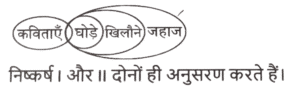न्यायवाक्य (भाग-V)Total Questions: 6341. दिए गए निष्कर्षों में से कौन सा कथन से तार्किक रूप से अनुसरण करता है। [SSC CHSL 16/03/2023 (4th Shift)]कथन : I. सभी चाँदी सोना है। II. कोई सोना प्लैटिनम नहीं है। निष्कर्ष : I. कुछ सोना चाँदी है। ॥. कुछ चाँदी प्लैटिनम है।(a) निष्कर्ष। और ।। में से कोई भी कथनों के अनुसार नहीं है(b) केवल निष्कर्ष ।। कथनों के अनुसार है(c) दोनों निष्कर्ष। और ।। कथनों के अनुसार है(d) केवल निष्कर्ष। कथनों के अनुसार हैCorrect Answer: (d) केवल निष्कर्ष। कथनों के अनुसार हैSolution:42. दिए गए निष्कर्षों में से कौन सा कथन से तार्किक रूप से अनुसरण करता है। [SSC CHSL 17/03/2023 (3rd Shift)]कथन : I. सभी S, R हैं। II. कोई R, T नहीं है। निष्कर्ष : I. कोई T, R नहीं है। II. कोई S, T नहीं है। III. कोई R, S नहीं है।(a) सभी निष्कर्ष अनुसरण करते हैं(b) दोनों निष्कर्ष। और ।। अनुसरण करते हैं(c) दोनों निष्कर्ष ॥ और ।।। अनुसरण करते हैं(d) दोनों निष्कर्ष। और ।।। अनुसरण करते हैंCorrect Answer: (b) दोनों निष्कर्ष। और ।। अनुसरण करते हैंSolution:43. दिए गए निष्कर्षों में से कौन सा कथन से तार्किक रूप से अनुसरण करता है। [SSC CGL Tier II (03/03/2023)]कथन : कुछ कविताएँ घोड़े हैं। सभी घोड़े खिलौने हैं। सभी खिलौने जहाज हैं। निष्कर्ष : I. सभी खिलौने के कविता होने की संभावना है। ।।. कुछ घोड़े जहाज हैं।(a) निष्कर्ष। और ।। दोनों ही अनुसरण करते हैं।(b) या तो निष्कर्ष। या ।। अनुसरण करता है।(c) केवल निष्कर्ष । अनुसरण करता है।(d) न तो निष्कर्ष। और न ही निष्कर्ष ॥ अनुसरण करता है।Correct Answer: (a) निष्कर्ष। और ।। दोनों ही अनुसरण करते हैं।Solution:44. दिए गए निष्कर्षों में से कौन सा कथन से तार्किक रूप से अनुसरण करता है। [SSC CGL Tier II (07/03/2023)]कथन : कुछ चूड़ियाँ, कंगन हैं। सभी चेन, अंगूठियाँ हैं। कुछ कंगन, चेन हैं। निष्कर्ष : (I) कुछ चूड़ियाँ, अंगूठियाँ हैं। (II) कुछ चेन, चूड़ियाँ हैं। (III) कुछ अंगूठियाँ, कंगन हैं।(a) केवल निष्कर्ष II अनुसरण करता है।(b) निष्कर्ष। और ।। दोनों अनुसरण करते हैं।(c) निष्कर्ष। और ।।। दोनों अनुसरण करते हैं।(d) केवल निष्कर्ष। अनुसरण करता है।Correct Answer: (a) केवल निष्कर्ष II अनुसरण करता है।Solution:45. दिए गए निष्कर्षों में से कौन सा कथन से तार्किक रूप से अनुसरण करता है। [SSC CGL 01/12/2022 (2nd Shift)]कथन: कुछ डॉक्टर पेंटर हैं। कुछ डॉक्टर मजदूर हैं। सभी मजदूर एथलीट हैं। निष्कर्ष : I. कुछ मजदूर पेंटर हैं। ।।. कुछ एथलीट डॉक्टर हैं। III. सभी डॉक्टर एथलीट हैं। IV. कुछ एथलीट पेंटर हैं।(a) केवल निष्कर्ष ॥ और ।।। अनुसरण करते हैं(b) केवल निष्कर्ष ।। अनुसरण करता है(c) केवल निष्कर्ष ।।। अनुसरण करता है(d) केवल निष्कर्ष। और ।। अनुसरण करते हैंCorrect Answer: (b) केवल निष्कर्ष ।। अनुसरण करता हैSolution:46. दिए गए निष्कर्षों में से कौन सा कथन से तार्किक रूप से अनुसरण करता है। [SSC CGL 01/12/2022 (4th Shift)]कथन : I. कुछ सफेद कार हैं। ।।. कोई ट्रक कार नहीं है। निष्कर्ष : I. सभी ट्रक सफेद हैं। ।।. कुछ