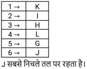 3. G, H, I, J, K और L एक ही इमारत की छह अलग-अलग मंजिलों पर रहते हैं। इमारत में सबसे निचली मंजिल की संख्या 6 है, इसके ऊपर की मंजिल की संख्या 5 है, और इसी प्रकार सबसे ऊपर की मंजिल की संख्या 1 है। J एक सम संख्या वाली मंजिल पर रहता है। G और K में से प्रत्येक विषम संख्या वाली मंजिल पर रहता हैं, । मंजिल संख्या 2 पर रहता है। H, L के ठीक ऊपर और। के ठीक नीचे एक विषम संख्या वाली मंजिल पर रहता है। G सबसे ऊपरी मंजिल पर नहीं रहता है। सबसे नीचे वाली मंजिल पर कौन रहता है ?