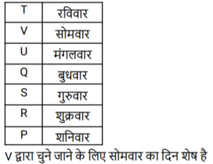 7. 7 मित्रों ने रविवार से शुरू होकर शनिवार को समाप्त होने वाले एक ही सप्ताह के किसी एक दिन अपनी पसंद की मिठाई नहीं खाने का फैसला किया। प्रत्येक मित्र ने सप्ताह के अलग-अलग दिन को चुना। P ने शनिवार का दिन चुना। Q ने बुधवार का दिन चुना। R ने कहा कि वह P के ठीक पहले वाले दिन का चयन करेगा। S ने P और Q द्वारा चुने गए दिनों के बीच किसी भी उपलब्ध दिन को चुना। T ने रविवार का दिन चुना। U ने कहा कि वह Q के ठीक पहले वाले दिन का चयन करेगा। अब V द्वारा चुने जाने के लिए कौन सा दिन शेष है?