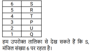 4. P, Q, R, S, T और U एक ही इमारत की छह अलग-अलग मंजिलों पर रहते हैं। इमारत में सबसे निचली मंजिल की संख्या 1 है, इसके ऊपर की मंजिल की संख्या 2 है, और इसी तरह सबसे ऊपर की मंजिल की संख्या 6 है। ठीक तीन व्यक्ति R और Q की मंजिलों के बीच रहते हैं। T, P की मंजिल के ठीक ऊपर वाली मंजिल पर रहता है। U, Q की मंजिल के ठीक ऊपर वाली मंजिल पर रहता है। R, S की मंजिल के ठीक नीचे वाली मंजिल पर रहता है। मंजिल संख्या 4 पर रहता है। Q मंजिल संख्या 5 पर नहीं रहता है। मंजिल संख्या 6 पर कौन रहता है?