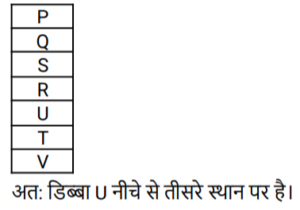 8. सात डिब्बों - F. Q.R.STU और V. को एक के ऊपर एक रखा गया है, किंतु उनका इसी क्रम में होना अनिवार्य नहीं है। R के नीचे केवल तीन डिब्बे रखे गए है। S. Q के ठीक नीचे है। V. T के ठीक नीचे है। P, Q के ठीक ऊपर है। S ऊपर से तीसरा डिब्बा है। TR के ठीक नीचे नहीं है। नीचे से तीसरा डिब्बा कौन सा है?