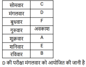 5. A, B, C, D, E और F में से प्रत्येक की परीक्षा, सोमवार से शुरू होकर उसी सप्ताह के रविवार को समाप्त होने वाले किसी एक सप्ताह के अलग-अलग दिन होनी है। सप्ताह में गुरुवार एकमात्र अवकाश का दिन है, जिस दिन कोई परीक्षा आयोजित नहीं की जानी है। E की परीक्षा शनिवार को है। A और F की परीक्षाओं के बीच एक दिन का अंतर है, जो कि अवकाश का दिन है। D की परीक्षा, F की परीक्षा के ठीक पहले है, लेकिन C की परीक्षा के ठीक बाद है। B की परीक्षा रविवार को है। D की परीक्षा किस दिन आयोजित की जानी है?