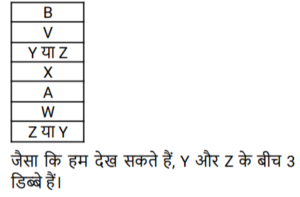 6. V, W, X, Y, Z, A और B सात डिब्बे हैं, जिन्हें एक के ऊपर एक रखा गया है, किंतु उनका इसी क्रम में होना अनिवार्य नहीं है। A को W के ठीक ऊपर रखा गया है। B और W के बीच केवल चार डिब्बे रखे गए हैं। ✓ और x के बीच केवल एक डिब्बा रखा गया है। X को A के ठीक ऊपर रखा गया है। B को सबसे ऊपर रखा गया है। Z और Y के बीच कितने डिब्बे रखे गए हैं?