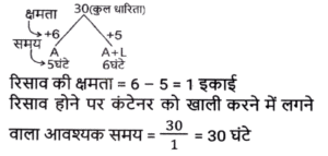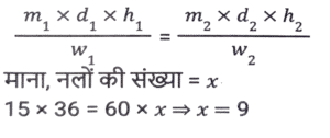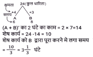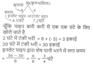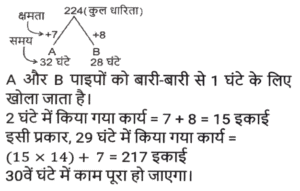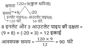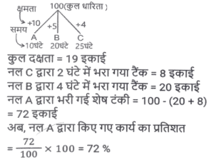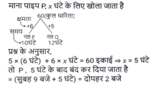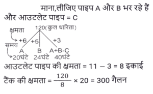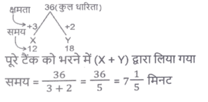 पाइप और टंकी (Part-II)Total Questions: 191. एक इनलेट पाइप एक खाली टैंक को 120 घंटे में भर सकता है, जबकि एक आउटलेट पाइप पूरी तरह से भरे टैंक को 54 घंटे में खाली कर देता है। यदि टैंक खाली होने पर 8 इनलेट पाइप और 3 आउटलेट पाइप एक साथ खोले जाते हैं, तो टैंक कितने घंटे में पूरी तरह से भर जाएगा ? [SSC CGL 20/07/2023 (1st shift)](a) 81(b) 96(c) 72(d) 90Correct Answer: (d) 90Solution:2. एक इनलेट पाइप एक खाली टैंक को 4½ घंटे में भर सकता है, जबकि एक 2 आउटलेट पाइप पूरी तरह से भरे टैंक को 7⅕ घंटे में खाली कर देता है। टैंक शुरू में खाली है और इनलेट पाइप से शुरू होते हुए दोनों पाइप बारी-बारी से एक-एक घंटे के लिए खोले जाते हैं, जब तक कि टैंक पूरी तरह से भर न जाए। टेंक कितने घंटे में पूरी भर जाएगी ? [SSC CGL 21/07/2023 (2nd shift)](a) 24(b) 20¼(c) 20¾(d) 22⅜Correct Answer: (c) 20¾Solution:3. दो नल P और Q अकेले एक टंकी को क्रमशः 10 घंटे और 12 घंटे में भर सकते हैं। यदि दोनों नलों को सुबह 9 बजे खोला जाए, तो ठीक दोपहर 3 बजे तक टंकी को पूरा भरने के लिए नल P को कितने बजे बंद करना होगा ? [SSC MTS 16/06/2023 (Morning)](a) दोपहर 2 बजे(b) दोपहर 1 बजे(c) दोपहर 3 बजे(d) दोपहर 12 बजेCorrect Answer: (a) दोपहर 2 बजेSolution:4. दो पाइप अकेले एक टंकी को क्रमशः 20 घंटे और 24 घंटे में भर सकते हैं और एक निकासी पाइप अकेले प्रति घंटे 20 गैलन (gallons) पानी खाली कर सकता है। तीनों पाइप एक साथ काम करते हुए उसी खाली टंकी को 40 घंटे में भर सकते हैं। टंकी की क्षमता (धारिता) कितनी है? [SSC MTS 16/06/2023 (Afternoon)](a) 450 गैलन(b) 300 गैलन(c) 600 गैलन(d) 480 गैलनCorrect Answer: (b) 300 गैलनSolution:5. 15 नल एक टंकी को 36 मिनट में भर सकते हैं। टंकी को एक घंटे में भरने के लिए कितने नलों की आवश्यकता होगी ? [SSC CHSL 15/03/2023 (2nd Shift)](a) 12(b) 9(c) 8(d) 6Correct Answer: (b) 9Solution:6. एक टैंक से दो इनलेट A और B जुड़े हुए हैं। A और B टैंक को क्रमशः 32 घंटे और 28 घंटे में भर सकते हैं। यदि दोनों पाइपों को A से शुरू करते हुए, बारी बारी से, 1 घंटे के लिए खोला जाता है, तो टैंक कितने समय में (घंटों में, निकटतम पूर्णांक तक) भर जाएगा ? [SSC CGL Tier II (03/03/2023)](a) 22(b) 30(c) 36(d) 24Correct Answer: (b) 30Solution:7. एक टैंक में 3 नल A, B और C हैं। ये टैंक को क्रमश: 10 घंटे, 20 घंटे और 25 घंटे में भर सकते हैं। सबसे पहले तीनों नल एक साथ खोले जाते हैं। 2 घंटे के बाद, नल C बंद हो जाता है और A और B चलते रहते हैं। प्रारंभ से 4 घंटे बाद नल B भी बंद हो जाता है। शेष टंकी को अकेले नल A से भरा जाता है। नल A के द्वारा किए गए कार्य का प्रतिशत ज्ञात कीजिए। [SSC CGL 05/12/2022 (4th Shift)](a) 32%(b) 75%(c) 52%(d) 72%Correct Answer: (d) 72%Solution:8. दो पाइप X और Y एक टैंक को क्रमशः 12 मिनट और 18 मिनट में भर सकते हैं। यदि दोनों पाइप एक साथ खोले जाते है, तो ये टंकी को भरने में कितना समय (मिनट में) लेंगे? [Higher Secondary 03/08/2022 (Shift-4)](a) 15(b) 5/36(c) 14(d) 7⅕Correct Answer: (d) 7⅕Solution:9. पाइप A एक खाली टंकी को 6 घंटे में भर सकता है और पाइप B उसी खाली टंकी को 8 घंटे में भर सकता है। दोनों पाइपों को एक साथ खोला जाता है लेकिन दो घंटे बाद पाइप A बंद कर दी जाती है। टंकी के शेष भाग को भरने में B कितना समय लेगा ? [SSC MTS 21/07/202