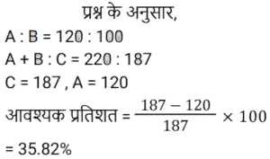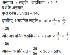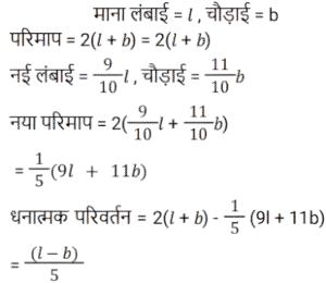 प्रतिशतTotal Questions: 5011. दो संख्याओं का योग 205 है। यदि इनमें से एक संख्या को 5% कम कर दिया जाए, और दूसरी संख्या को 10% बढ़ा दिया जाए, तो प्राप्त परिणामी संख्याएं बराबर होती हैं। दोनों प्रारंभिक संख्याओं में से छोटी संख्या ज्ञात कीजिए। [Group D 06/10/2022 (Morning)](a) 95 (b) 100 (c) 105 (d) 110Correct Answer: (a) 95 Solution:12. यदि किसी कमरे की लम्बाई (l) में 10% की कमी कर दी जाए तथा चौड़ाई (b) में 10% की वृद्धि कर दी जाए, तो इसके परिमाप में धनात्मक परिवर्तन ज्ञात कीजिए। [Group D 11/10/2022 (Evening)](a)(b)(c)(d)Correct Answer: (a)Solution:13. रवि को हैदराबाद से दिल्ली जाना है। हैदराबाद और दिल्ली के बीच की दूरी 1,200 kms है। वह 25% दूरी पैदल, 30% दूरी बस से, 15% दूरी रेलगाड़ी से और शेष दूरी हवाई जहाज से तय करने का निर्णय करता है। रवि द्वारा हवाई जहाज से तय की गई दूरी कितनी है? [NTPC CBT II Level 5 (12/06/2022) Shift 1](a) 300 km (b) 360 km(c) 580 km (d) 425 kmCorrect Answer: (b) 360 kmSolution:14. A और B ऐसी संख्याएँ हैं कि A, B से 40% अधिक है। यदि A को 20% घटाया जाता है और B को 38% बढ़ाया जाता है, तो A और B के कुल मूल्य में कितने प्रतिशत की वृद्धि होती है? [NTPC CBT II Level 2 (13/06/2022) Shift 1](a) 5% (b) 4⅙%(c) 8⅓% (d) 10%Correct Answer: (b) 4⅙%Solution:15. एक परीक्षा में A द्वारा प्राप्त अंक, B द्वारा प्राप्त अंकों से 20% अधिक हैं और C ने A और B द्वारा प्राप्त कुल अंकों का 85% प्राप्त किया है। A द्वारा प्राप्त अंक, C द्वारा प्राप्त अंकों से कितने प्रतिशत कम हैं? (एक दशमलव स्थान पर सही) [NTPC CBT II Level 3 (14/06/2022) Shift 2](a) 35.8% (b) 34.6% (c) 55.8% (d) 37.2%Correct Answer: (a) 35.8% Solution:16. कक्षा X में छात्रों की कुल संख्या 140 है और लड़कों का लड़कियों से अनुपात 2 : 3 है। यदि 50% लड़के और 33.33% लड़कियों को स्कूल में प्रतियोगिता के लिए चुना जाता है, तो अचयनित लड़कों का अचयनित लड़कियों से प्रतिशत ज्ञात कीजिए? [NTPC CBT II Level 5 (15/06/2022) Shift 3](a) 50% (b) 28% (c) 56% (d) 66.66%Correct Answer: (a) 50% Solution:17. एक आयत की भुजाओं के मापन के दौरान त्रुटिवश उनका माप 10% और 8% अधिक प्राप्त होता है। इसके क्षेत्रफल में होने वाली त्रुटि का प्रतिशत ज्ञात कीजिए। [NTPC CBT II Level 2 (16/06/2022) Shift 2](a) 1.88% (b) 188% (c) 18.8%(d) 0.188%Correct Answer: (c) 18.8%Solution:18. 2400 के 12% में क्या जोड़ा जाए कि योग 5400 के 18% के बराबर हो जाए? [NTPC CBT - I 28/12/2020 (Morning)](a) 952 (b) 972 (c) 684(d) 288Correct Answer: (c) 684Solution: 19. एक परीक्षा में, 55% अभ्यर्थी अंग्रेजी में, 35% अभ्यर्थी गणित में उत्तीर्ण हुए और 20% अभ्यर्थी दोनों विषयों में उत्तीर्ण हुए। यदि दोनों विषयों में अनुत्तीर्ण अभ्यर्थियों की कुल संख्या 1200 है, तो ज्ञात कीजिए कि कितने अभ्यर्थियों ने परीक्षा दी है? [NTPC CBT - I 29/12/2020 (Morning)](a) 2800 (b) 1200 (c) 4000(d) 3000Correct Answer: (c) 4000Solution:20. एक परीक्षा में, 41% छात्र अर्थशास्त्र में अनुत्तीर्ण हुए, 35% छात्र भूगोल में अनुत्तीर्ण हुए और 39% छात्र इतिहास में अनुत्तीर्ण हुए, 5% छात्र तीनों विषयों में अनुत्तीर्ण हुए, 14% छात्र अर्थशास्त्र और भूगोल में अनुत्तीर्ण हुए। 21% छात्र भूगोल और इतिहास में और 18% छात्र इतिहास और अर्थशास्त्र में अनुत्तीर्ण हुए। केवल अर्थशास्त्र में अनुत्तीर्ण होने वाले छात्रों का प्रत