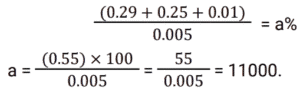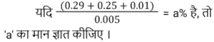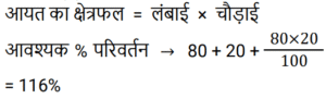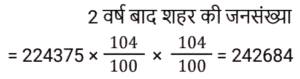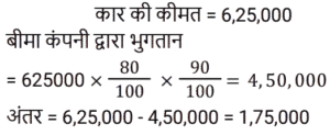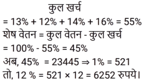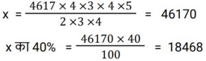 प्रतिशतTotal Questions: 5031. एक कार की कीमत 6,25,000 रुपये है। इसकी कीमत का 80% बीमा कराया गया था। कार पूरी तरह से क्षतिग्रस्त हो गई और बीमा कंपनी ने बीमा का 90% भुगतान किया। कार की कीमत और प्राप्त राशि के बीच क्या अंतर था? [NTPC CBT - I 03/04/2021 (Morning)](a) 18,000 (b) 1,50,000(c) 1,25,000 (d) 1,75,000Correct Answer: (d) 1,75,000Solution:32. एक डेस्कटॉप कंप्यूटर के मूल्य में प्रति वर्ष 20% की दर से ह्रास होता है। उसे 3 वर्ष पहले खरीदा गया था। यदि उसका वर्तमान मूल्य ₹12,288 है, तो 3 वर्ष पहले उसका मूल्य कितना था? [NTPC CBT - I 23/07/2021 (Morning)](a) 24,000 (b) 24,750(c) 23,750 (d) 24,250Correct Answer: (a) 24,000 Solution:33. रु. 15600 के मूल्य वाला एक कीमती नग गलती से गिर गया और तीन टुकड़ों में टूट गया, जिनके वजन क्रमशः: 2, 3, 5 इकाइयों के अनुपात में थे। नग का मूल्य सीधे उसके वजन के घन के साथ बदलता है। मूल्य में हुई प्रतिशत हानि की गणना करें। [RRB JE 30/05/2019 (Afternoon)](a) 84% (b) 16% (c) 75% (d) 25%Correct Answer: (a) 84% Solution:34. दिए गए प्रश्न का उत्तर ज्ञात कीजिए ? [RRB JE 26/06/2019 (Evening)](a) 5000 (b) 500 (c) 11000(d) 110Correct Answer: (c) 11000Solution:35. यदि एक आयत की लंबाई में 80% की और चौड़ाई में 20% की वृद्धि हुई है, तो इसके क्षेत्रफल में कितनी वृद्धि होगी? [ALP Tier II 08/02/2019 (Morning)](a) 60% (b) 116%(c) 120% (d) 156%Correct Answer: (b) 116%Solution:36. किसी संख्या के 80% के 75% के 66.67% का 25%, 4617 है। तो उस संख्या का 40% क्या होगा? [RPF Constable 17/01/2019 (Morning)](a) 18468 (b) 18668(c) 18568 (d) 18768Correct Answer: (a) 18468 Solution:37. जेफरी अपने वेतन का 13% विकलांग संगठनों, 12% अनाथालयों, 14% शारीरिक रूप से विकलांग संगठनों और 16% चिकित्सा सहायता संगठनों को दान करते हैं। शेष राशि 23455 बैंक में मासिक खर्च के लिए जमा की जाती है। अनाथालय में दान की गई राशि ज्ञात कीजिए। [RPF S.I. 06/01/2019 (Morning)](a) 6652 (b) 6252(c) 6452 (d) 6852Correct Answer: (b) 6252Solution:38. पिछले साल रंजन का मासिक वेतन ₹34,500 था और इस साल उनका मासिक वेतन ₹38,640 है। तो रंजन के मासिक वेतन में पिछले वर्ष के मासिक वेतन की तुलना में कितने प्रतिशत वृद्धि हुई है? [Group D 17/08/2022 (Afternoon)](a) 12% (b) 13% (c) 15% (d) 20%Correct Answer: (a) 12% Solution:39. एक कस्बे की जनसंख्या 2,24,375 है। यदि यह 4% प्रति वर्ष की दर से बढ़ती है, तो 2 वर्ष बाद इसकी जनसंख्या कितनी होगी? [Group D 22/08/2022 (Morning)](a) 2,42,684 (b) 2,40,468(c) 2,36,864 (d) 2,32,846Correct Answer: (a) 2,42,684 Solution:40. राजीव के वेतन में पहले 40% की कमी की गई, और फिर 50% की वृद्धि की गई। नया वेतन उसके आरंभिक वेतन से कितने प्रतिशत कम है? [Group D 23/08/2022 (Evening)](a) 10% (b) 14% (c) 12% (d) 15%Correct Answer: (a) 10% Solution:Submit Quiz« Previous12345Next »
