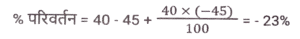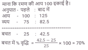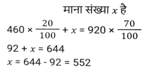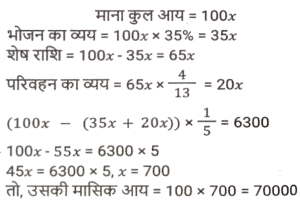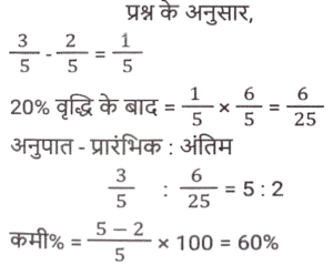 प्रतिशत SSC- मैथ्स (Part-III)Total Questions: 5011. जब किसी संख्या में 8 की वृद्धि की जाती है, तो वह स्वयं की 120% हो जाती है। वह संख्या ज्ञात कीजिए। [SSC CHSL 02/07/2024 (2nd Shift)](a) 50(b) 30(c) 60(d) 40Correct Answer: (d) 40Solution:माना संख्या = x प्रश्न के अनुसार, x + 8 = 6x/5 5x + 40 = 6x ⇒ x = 4012. एक सॉफ्टवेयर इंजीनियर के वेतन में से, यदि 15% मकान के किराए पर खर्च किया जाता है, शेष का 25% घरेलू सामान पर, शेष का 25% आयकर के रूप में, और शेष का 15% कपड़ों पर खर्च किया जाता है, तो उसके पास ₹10,404 शेष बचते हैं। उसका कुल वेतन ज्ञात कीजिए। [SSC CHSL 02/07/2024 (2nd Shift)](a) ₹25,600(b) ₹22,600(c) ₹23,600(d) ₹24,600Correct Answer: (a) ₹25,600Solution:13. किसी वस्तु की कीमत में पहले 40% की वृद्धि की जाती है और फिर बिक्री में कमी होने के कारण, 45% की कमी की जाती है। वस्तु के अंतिम मूल्य में कुल प्रतिशत परिवर्तन ज्ञात कीजिए। [SSC CHSL 02/07/2024 (3rd Shift)](a) -23%(b) 23%(c) 13%(d) -13%Correct Answer: (a) -23%Solution:14. वह संख्या कौन सी है, जिसे 460 के 20% में जोड़ने पर योग 920 के 70% के बराबर हो जाए? [SSC CHSL 02/07/2024 (3rd Shift)](a) 762(b) 926(c) 335(d) 552Correct Answer: (d) 552Solution:15. दो उम्मीदवारों के बीच एक चुनाव में एक उम्मीदवार को कुल वैध मतों के 65% मत प्राप्त हुए। 20% मत अवैध थे। यदि मतों की कुल संख्या 7,500 थी, तो दूसरे उम्मीदवार को मिले वैध मतों की संख्या _________ थी। [SSC CHSL 02/07/2024 (4th Shift)](a) 4,300(b) 1,900(c) 2,100(d) 1,700Correct Answer: (c) 2,100Solution:कुल वोटों की संख्या = 7500 वैध मतों की कुल संख्या = 7500 × 80% = 6000 आवश्यक वोटों की संख्या = 6000 × (35/100) = 210016. एक आदमी अपनी मासिक आय का 35% भोजन पर और शेष आय का 4/13 भाग परिवहन पर खर्च करता है। वह कुछ अन्य खर्च भी करता है, लेकिन प्रति माह Rs. 6,300 बचाता है, जो कि भोजन और परिवहन पर खर्च करने के बाद शेष राशि के 20% के बराबर है। उसकी मासिक आय (Rs. में) कितनी है? [SSC CHSL 02/07/2024 (4th Shift)](a) 63000(b) 72,000(c) 67500(d) 70,000Correct Answer: (d) 70,000Solution:17. दो उम्मीदवारों के बीच हुए एक चुनाव में, 78% मत प्राप्त करने वाला उम्मीदवार 448 मतों के बहुमत से निर्वाचित होता है। डाले गए मतों की कुल संख्या ज्ञात करें। [SSC CHSL 03/07/2024 (1st Shift)](a) 800(b) 750(c) 850(d) 700Correct Answer: (a) 800Solution:चुनाव हारने वाले उम्मीदवार को मिले वोट = 100 - 78 = 22% वोट वोटों में अंतर = 78 - 22 = 56% (अंतर) 56% = 448 कुल वोट (100%) = (448/56) × 100 = 80018. रमण अपनी आय का 75% खर्च करता है। उसकी आय में 25% की वृद्धि होती है और वह अपने व्यय में 10% की वृद्धि करता है। उसकी बचत में कितने प्रतिशत की वृद्धि हुई है ? [SSC CHSL 03/07/2024 (2nd Shift)](a) 50%(b) 60%(c) 40%(d) 70%Correct Answer: (d) 70%Solution:19. एक व्यक्ति 10 कुर्सियां खरीदना चाहता है। 10 कुर्सियों का कुल मूल्य ₹4,500 है। सौदेबाजी के बाद, दुकानदार प्रत्येक कुर्सी के मूल्य में 20% की कमी करने के लिए सहमत होता है जिसके बाद व्यक्ति ने 10% कुर्सियां अधिक खरीदीं। उसके द्वारा खरीदी गई कुर्सियों का मूल्य क्या होगा ? [SSC CHSL 03/07/2024 (2nd Shift)](a) ₹3,960(b) ₹3,260(c) ₹3,900(d) ₹4,100Correct Answer: (a) ₹3,960Solution:1 कुर्सी की कीमत = 4500/10 = 450 20% वृद्धि के बाद 1 कुर्सी की कीमत = 450 × 80% = 360 उसके द्वारा खरीदी गई कुर्सियों की संख्या = 10 × 110% = 11 उसके द्वारा खरीदी गई कुर्सियों की कुल लागत = 360 × 11 = ₹396020. एक भिन्न 3/5 में से 