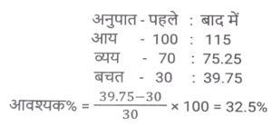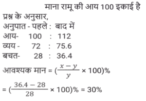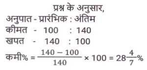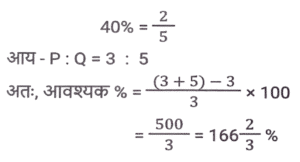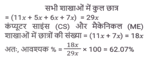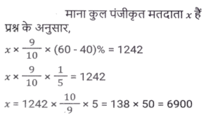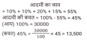 प्रतिशत SSC- मैथ्स (Part-III)Total Questions: 5021. दो उम्मीदवारों के बीच एक चुनाव में पंजीकृत मतदाताओं में से 10% ने अपना मत नहीं डाला। जीतने वाले उम्मीदवार ने डाले गए कुल मतों का 60% प्राप्त किया और दूसरे उम्मीदवार को 1242 मतों से हराया। पंजीकृत मतदाताओं की कुल संख्या ज्ञात कीजिए। [SSC CHSL 03/07/2024 (3rd Shift)](a) 6200(b) 8640(c) 6900(d) 9600Correct Answer: (c) 6900Solution:22. यदि P की आय Q से 40% कम है, तो P और Q की संयुक्त आय, P की आय से कितने प्रतिशत अधिक है? [SSC CHSL 03/07/2024 (3rd Shift)](a) 166⅓(b) 166⅔(c) 164⅓(d) 164⅔Correct Answer: (b) 166⅔Solution:23. एक इंजीनियरिंग कॉलेज में, कंप्यूटर साइंस (CS), इलेक्ट्रॉनिक्स (EC), सिविल (CE) और मैकेनिकल (ME) नाम की चार शाखाएँ हैं। इन शाखाओं में छात्रों की संख्या का क्रमशः अनुपात 11:5:6:7 है। कॉलेज में CS और ME शाखाओं के छात्रों का प्रतिशत क्या है (दशमलव के दो स्थानों तक सही) ? [SSC CHSL 03/07/2024 (4th Shift)](a) 62.37%(b) 62.07%(c) 61.37%(d) 61.07%Correct Answer: (b) 62.07%Solution:24. एक व्यक्ति अपनी आय का 10% किराने के सामान पर, 10% दवाओं पर, 20% बच्चों की शिक्षा पर, 15% घर के किराए पर खर्च करता है, और वह शेष राशि बचाता है। यदि उसकी मासिक आय ₹30,000 है, तो उसकी बचत ज्ञात कीजिए। [SSC CHSL 04/07/2024 (1st Shift)](a) ₹13,500(b) ₹16,500(c) ₹12,500(d) ₹15,500Correct Answer: (a) ₹13,500Solution:25. दो दलों के बीच एक राज्य के चुनाव में, 83% मतदाताओं ने अपने मत डाले, जिनमें से 4% मतों को अवैध घोषित कर दिया गया। दल A को 156611 मत मिले जो कुल वैध मतों का 83% था। उस चुनाव में नामांकित मतों की कुल संख्या ज्ञात कीजिए। (केवल पूर्णांक भाग पर विचार कीजिए) [SSC CHSL 04/07/2024 (1st Shift)](a) 23,46,807(b) 2,36,807(c) 2,34,888(d) 2,58,233Correct Answer: (b) 2,36,807Solution:26. राहुल अपनी आय का 70% खर्च करता है। उसकी आय में 15% की वृद्धि हुई और उसके व्यय में 7.5% की वृद्धि हुई। उसकी बचत में प्रतिशत वृद्धि कितनी है? [SSC CHSL 04/07/2024 (2nd Shift)](a) 32.5%(b) 25.5%(c) 50%(d) 30.5%Correct Answer: (a) 32.5%Solution:27. पिछले वर्ष, रंजन का मासिक वेतन ₹34,500 था और इस वर्ष उसका मासिक वेतन ₹38,640 है। इस वर्ष रंजन के मासिक वेतन में, पिछले वर्ष के मासिक वेतन की तुलना में कितने प्रतिशत की वृद्धि हुई है? [SSC CHSL 04/07/2024 (2nd Shift)](a) 15%(b) 13%(c) 12%(d) 20%Correct Answer: (c) 12%Solution:28. चावल के मूल्य में 25% की वृद्धि की जाती है लेकिन इसकी खपत में 30% की कमी हो जाती है। धन के व्यय में प्रतिशत वृद्धि या कमी ज्ञात कीजिए। [SSC CHSL 04/07/2024 (2nd Shift)](a) 12½% कमी(b) 13⅓% कमी(c) 12½% वृद्धि(d)13⅓% वृद्धिCorrect Answer: (a) 12½% कमीSolution:29. यदि चाय की कीमतों में 40% की वृद्धि होती है, तो चाय की खपत को कितने प्रतिशत कम किया जाना चाहिए ताकि व्यय में कोई वृद्धि न हो? [SSC CHSL 04/07/2024 (4th Shift)](a) 35⁹⁄₂ %(b) 28⁴⁄₇ %(c) 31⅗ %(d) 15²⁄₉ %Correct Answer: (b) 28⁴⁄₇ %Solution:30. रामू अपनी आय का 72% खर्च करता है। उसकी आय में 12% की वृद्धि होती है, और वह अपने खर्च में 5% की वृद्धि करता है। यदि रामू पहले 'y बचत करता था और वृद्धि के बाद अब वह "x बचत करता है, तो का मान क्या है? [SSC CHSL 04/07/2024 (4th Shift)](a) 25%(b) 22%(c) 27%(d) 30%Correct Answer: (d) 30%Solution:Submit Quiz« Previous12345Next »
