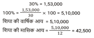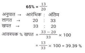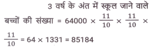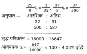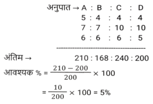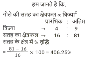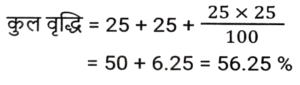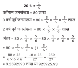 प्रतिशत SSC- मैथ्स (Part-IV)Total Questions: 5031. एक संख्या पहले 10% घटाई जाती है, फिर 30% बढ़ाई जाती है और फिर 20% घटाई जाती है। संख्या में शुद्ध कमी प्रतिशत कितना है? [SSC CPO 28/06/2024 (1st Shift)](a) 4⅕ %(b) 6⅖ %(c) 5⅗ %(d) 3¾ %Correct Answer: (b) 6⅖ %Solution:32. रामनारायण के वेतन में 3⅛% की कमी की गई, और फिर, कम किए गए वेतन में 7⅖% की वृद्धि की गई। उसका नया वेतन उसके मूल वेतन की तुलना में कितने प्रतिशत (दशमलव के दो स्थानों तक पूर्णांकित) अधिक/कम है? [SSC CPO 28/06/2024 (2nd Shift)](a) 3.03% कम(b) 4.04% अधिक(c) 4.04% कम(d) 3.03% अधिकCorrect Answer: (b) 4.04% अधिकSolution:33. शिया म्यूचुअल फंड में ₹1,53,000 का निवेश करती है, जो उसकी वार्षिक आय का 30% है। उसकी मासिक आय (₹ में) ज्ञात करें। [SSC CPO 28/06/2024 (2nd Shift)](a) 52,300(b) 45,800(c) 42,500(d) 55,600Correct Answer: (c) 42,500Solution:34. यदि किसी गोले की त्रिज्या में 125% की वृद्धि की जाती है, तो इसके पृष्ठीय क्षेत्रफल में कितने प्रतिशत की वृद्धि (दो दशमलव स्थान तक पूर्णांकित) होगी? [SSC CPO 28/06/2024 (2nd Shift)](a) 506.25%(b) 509.54%(c) 409.76%(d) 406.25%Correct Answer: (d) 406.25%Solution:35. एक शहर की जनसंख्या में 5% की वार्षिक दर से वृद्धि होती है। यदि शहर की जनसंख्या 16000 है, तो 2 वर्ष बाद जनसंख्या कितनी होगी? [SSC CPO 28/06/2024 (2nd Shift)](a) 17640(b) 17000(c) 17700(d) 17600Correct Answer: (a) 17640Solution:36. यदि किसी नगर में स्कूल जाने वाले बच्चों की संख्या 64000 है और इसमें प्रतिवर्ष 10% की वृद्धि हो रही है, तो 3 वर्ष के अंत में नगर में स्कूल जाने वाले बच्चों की संख्या कितनी होगी? [SSC CPO 28/06/2024 (3rd Shift)](a) 85100(b) 85184(c) 85000(d) 80000Correct Answer: (b) 85184Solution:37. संपीडित प्राकृतिक गैस (CNG) का मूल्य प्रति लीटर 65% बढ़ गया है। मनीष को CNG की खपत कितने प्रतिशत कम करना चाहिए, ताकि उसका व्यय न बढ़े? (दो दशमलव स्थानों तक) [SSC CPO 28/06/2024 (3rd Shift)](a) 39.39%(b) 30.13%(c) 45.13%(d) 25.39%Correct Answer: (a) 39.39%Solution:38. किसी वस्तु की 25% और 25% की दो क्रमिक मूल्य वृद्धि निम्नलिखित में से किस एकल मूल्य वृद्धि के बराबर हैं ? [SSC CPO 29/06/2024 (1st Shift)](a) 52.25%(b) 50.25%(c) 56.25%(d) 48.50%Correct Answer: (c) 56.25%Solution:39. A, B से 25% अधिक है और B, C से 30% कम है। यदि C, D से 20% अधिक हो, तो A, D से कितना प्रतिशत अधिक है ? [SSC CPO 29/06/2024 (1st Shift)](a) 3%(b) 6%(c) 5%(d) 2%Correct Answer: (c) 5%Solution:40. एक शहर की जनसंख्या में प्रति वर्ष 20% की वृद्धि होती है। यदि उसकी वर्तमान जनसंख्या 80 लाख हो, तो 3 वर्ष पूर्व की, और 2 वर्ष पूर्व की जनसंख्या के बीच का अंतर ज्ञात कीजिए। [SSC CPO 29/06/2024 (2nd Shift)](a) 75592.6(b) 85592.6(c) 65592.6(d) 925925.93Correct Answer: (d) 925925.93Solution:Submit Quiz« Previous12345Next »