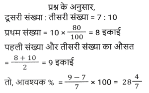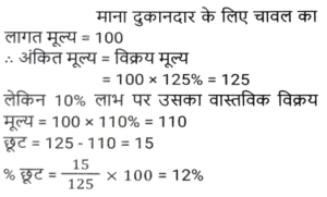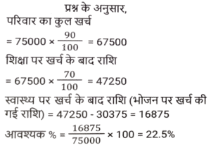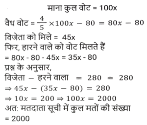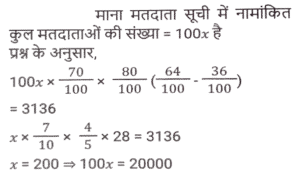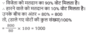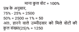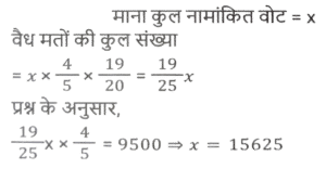 प्रतिशत SSC- मैथ्स (Part-V)Total Questions: 5031. एक संख्या में 25% की वृद्धि की जाती है और फिर 16% की कमी की जाती है। संख्या का अंतिम मान क्या होगा ? [SSC CHSL Tier II (02/11/2023)](a) 13% की कमी(b) 5% की वृद्धि(c) कोई बदलाव नहीं(d) 5% की कमीCorrect Answer: (b) 5% की वृद्धिSolution:32. एक बेईमान दुकानदार क्रय मूल्य पर चावल बेचता है लेकिन दोषपूर्ण बाटों का प्रयोग करके 25% लाभ अर्जित करता है। उसने अधिक ग्राहकों को आकर्षित करने के लिए छूट देने का निर्णय लिया। 10% लाभ अर्जित करने के लिए उसे कितने प्रतिशत की छूट देनी चाहिए ? [SSC CHSL Tier II (02/11/2023)](a) 11%(b) 12%(c) 10%(d) 9%Correct Answer: (b) 12%Solution:33. एक चुनाव में, 90% मत पाने वाला उम्मीदवार 800 मतों के अंतर से चुना जाता है। डाले गए कुल मतों की संख्या कितनी है? [SSC CHSL Tier II (10/01/2024)]ध्यान दें: चुनाव में केवल दो उम्मीदवार भाग ले रहे हैं और मान लीजिए सभी मत वैध हैं।(a) 1050(b) 950(c) 1000(d) 900Correct Answer: (c) 1000Solution:34. दो उम्मीदवारों के बीच हुए एक चुनाव में, 80% मतदाताओं ने मतदान किया, जिनमें से 5% मत अमान्य घोषित कर दिए गए। एक उम्मीदवार को 9500 मत मिले, जो वैध मतों के 80% के बराबर थे उस चुनाव में नामांकित मतदाताओं की कुल संख्या ज्ञात कीजिए। [SSC CPO 04/10/2023 (1st Shift)](a) 14780(b) 15625(c) 16100(d) 15100Correct Answer: (b) 15625Solution:35. निम्न में से कौन सा 1/5% के समतुल्य भिन्न है ? [SSC CPO 04/10/2023 (1st Shift)](a) 1/125(b) 1/500(c) 1/200(d) 1/40Correct Answer: (b) 1/500Solution:36. दो उम्मीदवारों के बीच हुए एक चुनाव में, 30% मतदाताओं ने मतदान नहीं किया। डाले गए मतों में से 20% मत अमान्य पाए गए। जीतने वाले उम्मीदवार को वैध मतों के 64% मत प्राप्त हुए, और वह 3136 मतों के साथ बहुमत से विजयी हुआ। मतदाता सूची में नामांकित मतदाताओं की संख्या ज्ञात करें। [SSC CPO 04/10/2023 (3rd Shift)](a) 24000(b) 20000(c) 25000(d) 30000Correct Answer: (b) 20000Solution:37. दो उम्मीदवारों के बीच हुए एक चुनाव में जीतने और हारने वाले उम्मीदवारों के बीच 2,500 मतों का अंतर था। जीतने वाले उम्मीदवार को 75% मत मिले। चुनाव में अमान्य मतों की संख्या शून्य थी। हारने वाले उम्मीदवार को मिले मतों की कुल संख्या कितनी थी? [SSC CPO 04/10/2023 (3rd Shift)](a) 1875(b) 1250(c) 5000(d) 3750Correct Answer: (b) 1250Solution:38. दो उम्मीदवारों के बीच हुए एक चुनाव में, मतदाता सूची के 20% मतदाताओं ने मतदान नहीं किया, और 80 मतदाताओं ने अपने मतपत्र खाली छोड़ दिए। विजेता उम्मीदवार ने मतदाता सूची में दर्ज कुल मतदाताओं के 45% मत प्राप्त किए और उसे अपने विरोधी उम्मीदवार से 280 मत अधिक मिले। सूची में मतदाताओं की संख्या कितनी थी ? [SSC CPO 05/10/2023 (1st Shift)](a) 2000(b) 2800(c) 2500(d) 1500Correct Answer: (a) 2000Solution:39. एक परिवार ₹75,000 कमाता है, जिसमें से 10% की बचत होती है। खर्च का 30% शिक्षा पर खर्च होता है, जबकि ₹30,375 स्वास्थ्य पर खर्च होता है, और शेष राशि भोजन पर खर्च की जाती है। कुल आय में भोजन पर होने वाले खर्च का प्रतिशत कितना है ? [SSC CPO 05/10/2023 (2nd Shift)](a) 20%(b) 21.5%(c) 22.5%(d) 32.5%Correct Answer: (c) 22.5%Solution:40. यदि पहली संख्या, तीसरी संख्या से 20% कम है तथा दूसरी और तीसरी संख्या का अनुपात 7 : 10 है, तो पहली और तीसरी संख्या का औसत, दूसरी संख्या से
