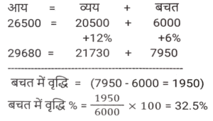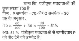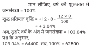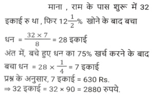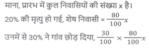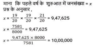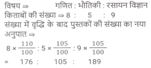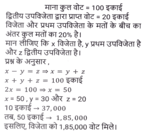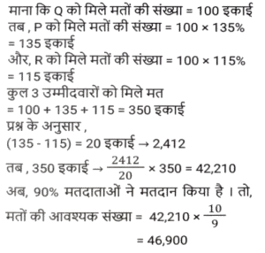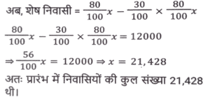 प्रतिशत SSC- मैथ्स (Part-VII)Total Questions: 5011. एक विश्वविद्यालय के पुस्तकालय में गणित, भौतिकी और रसायन विज्ञान की पुस्तकों की संख्या 8:5:9 के अनुपात में है। इन पुस्तकों में क्रमशः 10%, 5% और 5% की वृद्धि करने का प्रस्ताव है। वृद्धि के बाद पुस्तकों की संख्या का अनुपात क्या होगा ? [SSC CGL 02/12/2022 (4th Shift)](a) 212:117:47(b) 37:47:83(c) 176:105:189(d) 189:115:117Correct Answer: (c) 176:105:189Solution:12. राम के पास जितना धन था उसका 12½ % खो देता है और शेष धन का 75% खर्च करने के बाद उसके पास ₹630 शेष बचते हैं। राम के पास शुरू में कितने रूपये थे ? [SSC CGL 03/12/2022 (1st Shift)](a) ₹2,080(b) ₹2,880(c) ₹2,205(d) ₹2,808Correct Answer: (b) ₹2,880Solution:13. मिस्टर X की मासिक आय $26,500 है और उनका मासिक व्यय $20,500 है। अगले वर्ष, उनकी आय में 12% की वृद्धि होती है और व्यय में 6% की वृद्धि होती है। उसकी बचत में कितने प्रतिशत की वृद्धि होती है? [SSC CGL 05/12/2022 (3rd Shift)](a) 32.5%(b) 27.3%(c) 32.0%(d) 34.7%Correct Answer: (a) 32.5%Solution:14. पहले वर्ष के दौरान, एक कस्बे की जनसंख्या में 12% की वृद्धि हुई। अगले वर्ष किसी स्पर्शजन्य रोग के कारण इसमें 8% की कमी आई। दूसरे वर्ष के अंत में, जनसंख्या 64,400 थी। पहले वर्ष की शुरुआत में शहर की जनसंख्या ज्ञात कीजिए। [SSC CGL 05/12/2022 (4th Shift)](a) 50,000(b) 54,750(c) 62,500(d) 50,500Correct Answer: (c) 62,500Solution:15. दो उम्मीदवार P और Q ने एक चुनाव लड़ा। पंजीकृत मतदाताओं में से 70% मतदाता P के समर्थक हैं। यदि P के 60% समर्थकों और Q के 30% समर्थकों से उम्मीद की जाती है कि वे उम्मीदवार P को वोट देंगे, तो कितने प्रतिशत पंजीकृत मतदाताओं से उम्मीदवार P को वोट देने की उम्मीद है ? [SSC CGL 06/12/2022 (1st Shift)](a) 30%(b) 51%(c) 26%(d) 47%Correct Answer: (b) 51%Solution:16. यदि पेट्रोल की कीमत में 28% की वृद्धि होती है, तो उपभोक्ता द्वारा खपत में कितने प्रतिशत की कमी की जानी चाहिए, यदि पेट्रोल पर व्यय अपरिवर्तित रहता है? (2 दशमलव स्थानों तक सही) [SSC CGL 06/12/2022 (3rd Shift)](a) 12.35%(b) 21.88%(c) 20.25%(d) 25.75%Correct Answer: (b) 21.88%Solution:17. एक गाँव के 20% निवासियों की मलेरिया से मृत्यु हो गई, एक दहशत पैदा हो गई, जिसके दौरान, बचे हुए निवासियों में से 30% निवासियों ने गाँव छोड़ दिया। तब गाँव की जनसंख्या 12,000 हो गई। प्रारंभ में निवासियों की संख्या क्या थी। (उत्तर पूर्ण संख्या तक ज्ञात कीजिए) [SSC CGL 07/12/2022 (2nd Shift)](a) 21000(b) 21428(c) 21500(d) 30428Correct Answer: (b) 21428Solution:18. एक चुनाव में तीन उम्मीदवार भाग ले रहे थे। तीसरे स्थान पर रहने वाले व्यक्ति को कुल मतों का 20% प्राप्त हुआ जबकि विजेता और प्रथम उपविजेता के मतों का अंतर कुल मतों का 20% था। यदि प्रथम उपविजेता और द्वितीय उपविजेता के मतों का अंतर 37,000 था, तो विजेता को कितने मत प्राप्त हुए ? [SSC CGL 07/12/2022 (4th Shift)](a) 1,80,000(b) 1,85,000(c) 1,75,000(d) 1,95,000Correct Answer: (b) 1,85,000Solution:19. पहले वर्ष में कोरोना वायरस की पहली लहर के कारण एक शहर की आबादी 5% कम हो गई। अगले वर्ष दूसरी लहर के कारण यह आबादी फिर से 5% कम हो गई और तीसरे वर्ष में यह आबादी 5% बढ़ गई। तीसरे वर्ष के अंत में आबादी 9,47,625 थी। पहले वर्ष की शुरुआत में आबादी कितनी थी? [SSC CGL 08/12/2022 (3rd Shift)](a) 7,00,000(b) 10,00,000(c) 8,97,993(d) 9,92,519Correct Answer: (b) 10,00,000Solutio