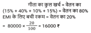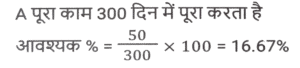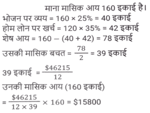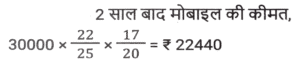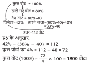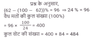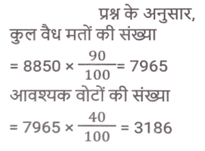 प्रतिशत SSC- मैथ्स (Part-VI)Total Questions: 5021. दो उम्मीदवारों के बीच हुए एक चुनाव में एक उम्मीदवार को कुल वैध मतों के 60% मत प्राप्त हुए। यदि डाले गए मतों की कुल संख्या 8850 थी और 10% मत अवैध थे, तो दूसरे उम्मीदवार को मिले वैध मतों की संख्या ज्ञात करें। [Matriculation Level 28/06/2023 (Shift-1)](a) 3816(b) 3186(c) 3681(d) 3618Correct Answer: (b) 3186Solution:22. दो उम्मीदवारों के बीच हुए चुनाव में, 84 मत अवैध घोषित किए गए। जीतने वाला उम्मीदवार को 62% वैध मत प्राप्त होते हैं और वह 96 मतों से जीत जाता है। डाले गए मतों की संख्या ज्ञात कीजिए । [Matriculation Level 28/06/2023 (Shift-1)](a) 424(b) 543(c) 641(d) 484Correct Answer: (d) 484Solution:23. परिवार का एक सदस्य अपनी मासिक आय का 25% भोजन पर खर्च करता है, शेष का 35% गृह ऋण और अन्य बैंक ऋणों पर तथा शेष का आधा बच्चों की शिक्षा पर खर्च करता है। यदि सदस्य प्रत्येक वर्ष $46,215 की बचत करता है, तो उसकी मासिक आय क्या है? [Matriculation Level 30/06/2023 (Shift-4)](a) $15,800(b) $190,248(c) $15,520(d) $19,200Correct Answer: (a) $15,800Solution:24. एक शहर की वार्षिक वृद्धि दर 2% है। यदि वर्ष 2020 में इसकी जनसंख्या 1,50,000 थी, तो 2023 में इसकी जनसंख्या कितनी होगी ? [SSC CHSL Tier II (26/06/2023)](a) 1,59,181(b) 1,58,765(c) 1,58,413(d) 1,59,000Correct Answer: (a) 1,59,181Solution:25. गीता एक अपार्टमेंट खरीदती है और उसके लिए EMI का भुगतान करती है। उसकी मासिक आय ₹80,000 है। वह अपने बच्चों की शिक्षा पर 15%, घरेलू कामकाज पर 40% खर्च करती है, GPF में 10% भेजती है, बचत बैंक खाते में 15% की बचत करती है और शेष राशि का भुगतान EMI के रूप में करती है। वह EMI के रूप में कितनी राशि का भुगतान करती है? [SSC CHSL Tier II (26/06/2023)](a) ₹14,000(b) ₹18,000(c) ₹16,000(d) ₹20,000Correct Answer: (c) ₹16,000Solution:26. दो उम्मीदवारों के बीच चुनाव में, पंजीकृत मतदाताओं में से 20% ने अपना मत नहीं दिया और 40 मत अवैध घोषित कर दिए गए। विजेता को पंजीकृत मतों का 42% प्राप्त हुआ और उसे 112 मतों से विजेता घोषित किया गया। पंजीकृत मतदाताओं की संख्या कितनी थी? [SSC CHSL Tier II (26/06/2023)](a) 1500(b) 1200(c) 1800(d) 3800Correct Answer: (c) 1800Solution:27. एक मोबाइल का मूल्य Rs. 30,000 है। पहले वर्ष के अंत में मोबाइल का मूल्य 12% घट जाता है और उसके अगले वर्ष के अंत में, यह 15% घट जाता है। 2 वर्ष बाद मोबाइल का मूल्य क्या होगा? (Rs. में) [SSC MTS 03/05/2023 (Afternoon)](a) 25,255(b) 22,440(c) 20,000(d) 25,000Correct Answer: (b) 22,440Solution:28. A अकेले किसी कार्य का आधा भाग 150 दिनों में पूरा कर सकता है। 50 दिनों में, A द्वारा कितने प्रतिशत कार्य पूरा किया जाएगा? [SSC MTS 03/05/2023 (Evening)](a) 16.67 प्रतिशत(b) 15 प्रतिशत(c) 20 प्रतिशत(d) 22.5 प्रतिशतCorrect Answer: (a) 16.67 प्रतिशतSolution:29. मनीषा के बटुए में Rs. 8000 हैं। फिर उसने इसे 10% से बढ़ा दिया। फिर उसने इसमें से 5% खर्च कर दिया। उसके बटुए में मौजूद धनराशि का अंतिम मूल्य, प्रारंभिक धनराशि से कितने प्रतिशत अधिक होगा? [SSC MTS 09 05/2023 (Evening)](a) 5%(b) 6%(c) 4.5%(d) 5.5%Correct Answer: (c) 4.5%Solution:30. अनिकेत का वार्षिक वेतन Rs. 1000000 से बढ़कर Rs. 1400000 हो गया। वृद्धि प्रतिशत क्या है ? [SSC MTS 16/05/2023 (Afternoon)](a) 14%(b) 40%(c) 20%(d) 4%Correct Answer: (b) 40%Solution:Submit Quiz« Previous12345Next »