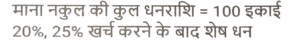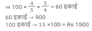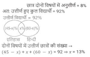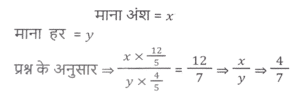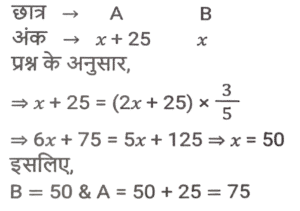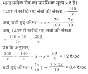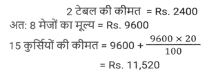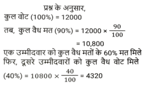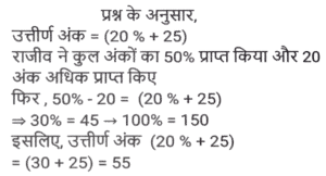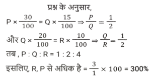प्रतिशत SSC- मैथ्स (Part-VI)Total Questions: 5041. तीन संख्याएँ P, Q और R दी गई है। P का 30 प्रतिशत Q के 15 प्रतिशत के बराबर है। Q का 20 प्रतिशत R के 10 प्रतिशत के बराबर है। R, P से कितने प्रतिशत अधिक है? [SSC CHSL 13/03/2023 (2nd Shift)](a) 200%(b) 300%(c) 150%(d) 250%Correct Answer: (b) 300%Solution:42. दो उम्मीदवारों के बीच एक चुनाव में, एक को कुल 60% मान्य मत प्राप्त हुए, 90% मत मान्य थे। यदि कुल मतों की संख्या 12000 थी, तो दूसरे उम्मीदवार को मिले मान्य मतों की संख्या क्या थी? [SSC CHSL 13/03/2023 (4th Shift)](a) 8840(b) 4320(c) 10800(d) 6200Correct Answer: (b) 4320Solution:43. राजीब ने एक परीक्षा में 20 प्रतिशत अंक प्राप्त किए और 25 अंकों से अनुत्तीर्ण हो गया। यदि वह 50 प्रतिशत अंक प्राप्त करता, तो उसे उत्तीर्ण अंकों से 20 अंक अधिक प्राप्त होते। परीक्षा में उत्तीर्ण होने के लिए कितने अंक आवश्यक हैं? [SSC CHSL 14/03/2023 (1st Shift)](a) 40(b) 35(c) 55(d) 45Correct Answer: (c) 55Solution:44. छात्र A को छात्र B से 25 अंक अधिक मिले और A के अंक उन दोनों के अंकों के योग के 60 प्रतिशत के बराबर थे। A और B द्वारा अलग -अलग क्रमशः कितने अंक प्राप्त किए गए हैं? [SSC CHSL 14/03/2023 (3rd Shift)](a) 75, 100(b) 75, 50(c) 45, 120(d) 55, 80Correct Answer: (b) 75, 50Solution:45. नकुल किराने का सामान लेने बाजार गया था। उसके पास कुछ पैसे हैं, जिसमें से 20% से वह गेहूँ का आटा खरीदता है, शेष राशि में से 25% खाना पकाने के तेल पर खर्च किया जाता है। यदि उसके पास Rs.900 बचते हैं, तो ज्ञात कीजिए कि नकुल के पास कुल कितनी धनराशि थी। [SSC CHSL 15/03/2023 (1st Shift)](a) Rs.1,500(b) Rs.1,200(c) Rs.1,350(d) Rs.1,800Correct Answer: (a) Rs.1,500Solution:46. यदि सेब की कीमत 30 प्रतिशत कम कर दी जाती है, तो ग्राहक Rs.140 में 5 और सेब खरीद सकता है। सेब की घटी हुई दर ज्ञात कीजिए । [SSC CHSL 15/03/2023 (3rd Shift)](a) Rs.14(b) Rs.12(c) Rs.7(d) Rs.8.4Correct Answer: (d) Rs.8.4Solution:47. 15 कुर्सियों का मूल्य 8 मेजों के मूल्य से 20 प्रतिशत अधिक है। यदि 2 मेजों का मूल्य Rs. 2400 है, तो 15 कुर्सियों का मूल्य कितना है? [SSC CHSL 16/03/2023 (1st Shift)](a) Rs. 10,320(b) Rs. 12,380(c) Rs. 11,520(d) Rs. 10,780Correct Answer: (c) Rs. 11,520Solution:48. यदि किसी भिन्न के अंश में 140% की वृद्धि की जाए और भिन्न के हर में 20% की कमी की जाए, तो परिणामी भिन्न 12/7 है। मूल भिन्न जात कीजिए। [SSC CHSL 17/03/2023 (1st Shift)](a) 4/9(b) 4/7(c) 7/6(d) 8/9Correct Answer: (b) 4/7Solution:49. एक परीक्षा में 45 प्रतिशत विद्यार्थी इतिहास में और 60 प्रतिशत विद्यार्थी हिन्दी में उत्तीर्ण हुए। यदि 8 प्रतिशत विद्यार्थी दोनों विषयों में अनुत्तीर्ण हुए, तो दोनों विषयों में कितने प्रतिशत विद्यार्थी उत्तीर्ण हुए ? [SSC CHSL 17/03/2023 (4th Shift)](a) 15%(b) 10%(c) 13%(d) 12%Correct Answer: (c) 13%Solution:50. P की आय Q की आय का 150 प्रतिशत है और P का व्यय Q के व्यय का 60 प्रतिशत है। यदि Q अपनी आय के 20 प्रतिशत की बचत करता है, तो P अपनी आय से कितने प्रतिशत की बचत करता है ? [SSC CHSL 20/03/2023 (2nd Shift)](a) 68%(b) 60%(c) 72%(d) 75%Correct Answer: (a) 68%Solution:Submit Quiz« Previous12345