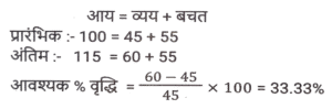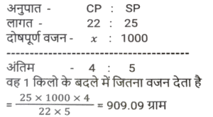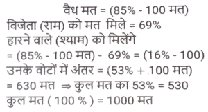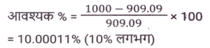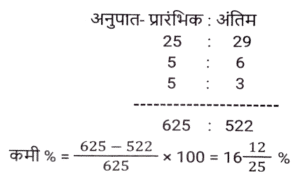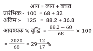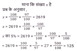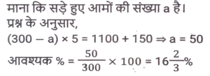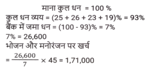 प्रतिशत SSC- मैथ्सTotal Questions: 5011. आयुष एक राशि का 25% बीमा पॉलिसी पर, 26% भोजन पर, 23% बच्चों की शिक्षा पर, और 19% मनोरंजन पर खर्च करता है। वह शेष ₹26,600 बैंक में जमा करता है। वह भोजन और मनोरंजन पर कुल-मिलाकर कुल कितनी राशि (श्में) खर्च करता है? [SSC CPO 05/10/2023 (3rd Shift)](a) 1,95,000(b) 1,83,000(c) 1,62,000(d) 1,71,000Correct Answer: (d) 1,71,000Solution:12. दालों का क्रय मूल्य, विक्रय मूल्य से 12% कम है। एक खराब तौल मशीन का उपयोग करके दुकानदार 25% लाभ अर्जित करने में सक्षम है। दोषपूर्ण मशीन वास्तविक वजन की तुलना में कितने प्रतिशत अधिक वजन दिखाती है (निकटतम पूर्णांक तक पूर्णांकित)? [SSC CPO 04/10/2023 (3rd Shift)](a) 10%(b) 14%(c) 13%(d) 15%Correct Answer: (a) 10%Solution:13. स्वास्तिक अपनी आय का 20% बचाता है, जबकि शेष राशि भोजन, किराए, शिक्षा और खरीदारी पर खर्च करता है। आय का 15% भोजन पर खर्च किया जाता है, जबकि ₹12,800 किराए पर, ₹32,000 शिक्षा पर और ₹7,200 खरीदारी पर खर्च किए जाते हैं। खरीदारी पर खर्च की गई राशि, कुल खर्च की 11.25% है। भोजन पर कितना धन (₹ में) खर्च किया जाता है? [SSC CPO 03/10/2023 (2nd Shift)](a) 9600(b) 12000(c) 15000(d) 10800Correct Answer: (b) 12000Solution:14. एक संख्या में पहले 16% की वृद्धि की जाती है और फिर उसी संख्या में दोबारा 20% की वृद्धि की जाती है। इस प्रकार प्राप्त संख्या में अब 40% की कमी की जाती है। मूल संख्या में निवल कमी प्रतिशत कितना है? [SSC CHSL 14/08/2023 (4th Shift)](a) 16¹²⁄₁₅ %(b) 15⁹⁄₂₅ %(c) 11¹³⁄₂₅ %(d) 13⁷⁄₂₅ %Correct Answer: (a) 16¹²⁄₁₅ %Solution:15. एक संख्या में पहले 8% की वृद्धि की जाती है ओर फिर 3% की कमी की जाती है ताकि संख्या 2619 प्राप्त की जा सके। उस संख्या का 5% कितना है ? [SSC CHSL 10/08/2023 (3rd Shift)](a) 125(b) 135(c) 130(d) 140Correct Answer: (a) 125Solution:16. A अपनी मासिक आय का 68% खर्च करता है। यदि A की मासिक आय में 25% की वृद्धि होती है और उसकी मासिक बचत में 15% की वृद्धि होती है, तो उसके मासिक व्यय में कितने प्रतिशत वृद्धि होगी? [SSC CHSL 09/08/2023 (1st Shift)](a) 27¹³⁄₁₇ %(b) 29¹²⁄₁₇ %(c) 33 ⁷⁄₁₇ %(d) 31⁶⁄₁₇ %Correct Answer: (b) 29¹²⁄₁₇ %Solution:17. हर्षा का व्यय उसकी आय का 45% है। यदि उसकी आय में अगले माह से 15% की वृद्धि होती है और वृद्धि के पश्चात भी प्रत्येक माह उसके द्वारा की जाने वाली बचत की राशि समान रहती है, तो उसके व्यय में हुई वृद्धि का प्रतिशत ज्ञात कीजिए (दशमलव के 2 स्थानों तक सन्निकटित कीजिए) । [SSC CHSL 07/08/2023 (4th Shift)](a) 33.33%(b) 15.00%(c) 45.00%(d) 27.50%Correct Answer: (a) 33.33%Solution:18. एक वस्तु के मूल्य में r% की वृद्धि की जाती है। बाद में इस नए मूल्य में r% की कमी कर दी जाती है। अब नवीनतम मूल्य Rs. 1 है। उस वस्तु का प्रारंभिक मूल्य कितना था ? [SSC CGL 20/07/2023 (3rd shift)](a)(b)(c)(d)Correct Answer: (a)Solution:19. आदित्य Rs. 1,100 में 300 आम खरीदता है। इनमें से कुछ आम सड़े हुए होते हैं और फेंक दिए जाते हैं। वह शेष आमों को Rs.5 प्रत्येक की दर पर बेचता है और Rs.150 का लाभ कमाता है। फेंके गए आमों का प्रतिशत ज्ञात कीजिए । [SSC CGL 19/07/2023 (4th shift)](a) 16½ %(b) 15⅔ %(c) 16⅔ %(d) 16⅓ %Correct Answer: (c) 16⅔ %Solution:20. एक चुनाव में, मतदाता सूची के 15% मतदाताओं ने अपना मत नहीं डाला और 100 मतदाताओं ने अपना मतपत्र खाली छोड़ दिया। राम और श्याम दो ह