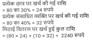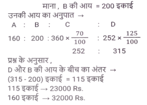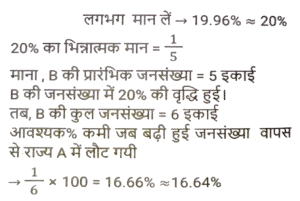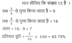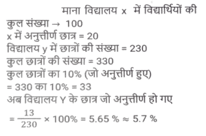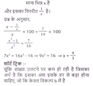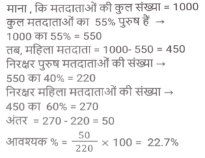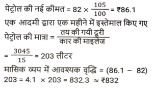 प्रतिशत SSC- मैथ्सTotal Questions: 5031. पेट्रोल की कीमत में 5% की तेजी आई। बढ़ोतरी से पहले कीमत 82 रुपये प्रति लीटर थी। एक आदमी हर महीने 3045 किलोमीटर की यात्रा करता है और उसकी कार 15 किलोमीटर प्रति लीटर का माइलेज देती है। पेट्रोल की कीमतों में वृद्धि के कारण आदमी की यात्रा पर मासिक व्यय (निकटतम रुपये तक) में कितनी वृद्धि हुई है? [SSC CGL 12/04/2022 (Morning)](a) 832(b) 859(c) 758(d) 944Correct Answer: (a) 832Solution:32. एक निर्माण इकाई में, यह नोट किया गया कि कच्चे माल की कीमत में 25% की वृद्धि हुई है और श्रम लागत कच्चे माल की लागत के 30% से बढ़कर कच्चे माल की लागत का 38% हो गई है। कच्चे माल की खपत का कितना प्रतिशत कम किया जाए ताकि लागत वृद्धि से पहले की लागत को समान रखा जा सके ? [SSC CGL 11/04/2022 (Evening)](a) 20.7%(b) 30.2%(c) 24.6%(d) 25.6%Correct Answer: (c) 24.6%Solution:33. कुछ संकट के कारण, राज्य A के कुछ लोग राज्य B में चले गए, और इस प्रकार दूसरे राज्य की जनसंख्या में 19.96% की वृद्धि हुई। हालांकि, बाद में, वे सभी राज्य A में लौट आए। फिर राज्य B की जनसंख्या में कितने प्रतिशत (दो दशमलव स्थानों तक सही) की कमी आई ? [SSC MTS 05/10/2021 (Morning)](a) 19.96(b) 16.64(c) 18.24(d) 17.54Correct Answer: (b) 16.64Solution:34. गलती से एक धनात्मक भिन्न का व्युत्क्रम स्वयं के स्थान पर टाइप हो गया और इस प्रकार इसका मान 175/4 % कम हो गया। भिन्न का मान क्या था ? [SSC CGL 24/08/2021 (Evening)](a) 1/2(b) 4/3(c) 3/4(d) 1/4Correct Answer: (b) 4/3Solution:35. A की आय B की आय से 20% कम है और C की आय A और B की आय के योग का 70% है। D की आय C की आय से 25% अधिक है। यदि B और D की आय का अंतर रु 23000 है, तो A की आय (रुपये में) क्या है? [SSC CGL 18/08/2021 (Afternoon)](a) 32000(b) 25000(c) 26000(d) 28000Correct Answer: (a) 32000Solution:36. स्कूल X से एक निश्चित संख्या में छा छात्र एक परीक्षा में उपस्थित हुए और 20% छात्र असफल रहे। स्कूल Y से, स्कूल X की तुलना में 130% अधिक छात्र एक ही परीक्षा में उपस्थित हुए। यदि दोनों स्कूलों से उपस्थित छात्रों की कुल संख्या में से 90% उत्तीर्ण हुए, तो स्कूल Y से असफल होने वाले छात्रों का प्रतिशत क्या है (दशमलव के एक स्थान तक सही)? [SSC CGL 17/08/2021 (Morning)](a) 8.3%(b) 10%(c) 6.4%(d) 5.7%Correct Answer: (d) 5.7%Solution:37. 80 छात्र और 10 संसाधन व्यक्तियों वाली कार्यशाला में, कार्यशाला के अंत में मिठाई वितरित की गयी। प्रत्येक छात्र को मिठाई बांटने के लिए खर्च की गई राशि छात्रों की कुल संख्या का 30% थी और प्रत्येक संसाधन व्यक्ति के लिए खर्च की गई राशि छात्रों की कुल संख्या का 40% थी। कार्यशाला में मिठाई वितरण पर खर्च की गई कुल राशि ज्ञात करे ? [SSC CHSL 10/08/2021 (Afternoon)](a) Rs. 2400(b) Rs. 2440(c) Rs. 2420(d) Rs. 2240Correct Answer: (d) Rs. 2240Solution:38. एक निर्वाचन क्षेत्र में, कुल मतदाताओं की संख्या का 55% पुरुष हैं और शेष महिलाएं हैं। यदि 40% पुरुष अशिक्षित हैं और 40% महिलाएं साक्षर हैं, तो अशिक्षित महिलाओं की संख्या, अशिक्षित पुरुषों की संख्या से कितने प्रतिशत अधिक है (एक दशमलव स्थान तक सही) [SSC CHSL 04/08/2021 (Evening)](a) 22.7%(b) 16.4%(c) 21.5%(d) 20.8%Correct Answer: (a) 22.7%Solution:39. चीनी की कीमत में 20% की कमी होने पर एक क्रेता को 160 रुपये में 4 किलो अधिक चीनी