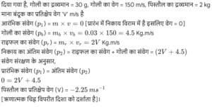 बल और दाब (भौतिक विज्ञान) (Part-II)Total Questions: 9891. किसी गेंद को यदि ऊपर की ओर 25 m/s के प्रारंभिक वेग से फेंका जाए तो इसे अपने उच्चतम बिंदु तक पहुँचने में कितना समय लगेगा। g का मान 10 m/s लिया जा सकता है। [RRB Group D 01/10/2018 (Morning)](a) 10 सेकंड(b) 2.5 सेकंड(c) 50 सेकंड(d) 5 सेकंडCorrect Answer: (b) 2.5 सेकंडSolution:दिया गया है : गेंद का प्रारंभिक वेग u= 25 m/s, गेंद का अंतिम वेग, v = 0, m/s, गुरुत्वाकर्षण के कारण त्वरण, g = -10 m/s² (ऊपर की ओर गति)।सूत्र का प्रयोग करके, v = u + at0 = 25 + (-10) × t10t = 25 ⇒ t = 2.5 s.92. 100 kg द्रव्यमान के एक पिंड की गति 5 s में 5 ms⁻¹ से 15 ms⁻¹ हो जाती है और उस पर एक समान त्वरण आरोपित है। पिंड पर आरोपित बल की गणना कीजिए ? [RRB Group D 01/10/2018 (Afternoon)](a) 200 Pa(b) 200 J(c) 200 kg(d) 200 NCorrect Answer: (d) 200 NSolution:दिया गया है कि, वस्तु का द्रव्यमान (m) = 100किलोग्राम है, प्रारंभिक वेग (u) = 5 m/s, अंतिम वेग (v)=15 m/s, समय (t) = 5 sec. हम जानते हैं, बल = द्रव्यमान × त्वरण = m × (v-u)/t ⇒ बल = 100 × (15-5)/5 = 200 N.93. किसी वस्तु पर लगाया गया बल 200 N है और उसका द्रव्यमान 100 kg है। वस्तु का त्वरण ज्ञात कीजिए। [RRB Group D 03/10/2018 (Morning)](a) 2 ms⁻¹(b) 2 ms⁻²(c) 2 ms¹(d) 20 ms⁻²Correct Answer: (b) 2 ms⁻²Solution:दिया गया है, बल = 200 N, द्रव्यमान = 100 किलोग्राम। बल = द्रव्यमान × त्वरण। प्रश्न के अनुसार त्वरण =Force/Mass = 200/100 = 2 ms⁻².94. रॉकेट की उड़ान के दौरान किसी भी समय जमीन से रॉकेट की ऊंचाई निर्धारित करने का सूत्र इस प्रकार दिया गया है: h = 119t - 7t² जहां t = समय, सेकंड में, जो रॉकेट लॉन्च होने के बाद से बीता है, और h = समय पर जमीन से ऊपर रॉकेट की ऊंचाई, मीटर में। जब रॉकेट जमीन से टकराया तो h का मान 0 था। रॉकेट लॉन्च होने के कितने सेकंड बाद यह जमीन पर गिरा? [RRB Group D 03/10/2018 (Afternoon)](a) 17(b) 10(c) 7(d) 0Correct Answer: (a) 17Solution:दिया गया है, (h=119t-7t² ∴ h=0) ⇒ h = 119t - 7t² 0 = 119t - 7t² ⇒ t = 17 सेकंड ।95. एक कार सड़क के किनारे से गिरकर 0.5s में जमीन पर आ पहुँचती है। अगर (g=10) ms⁻² है, तो जमीन से टकराते समय इसकी गति क्या होगी ? [RRB Group D 03/10/2018 (Evening)](a) 10 ms⁻²(b) 10 ms⁻¹(c) 5 ms⁻²(d) 5 ms⁻¹Correct Answer: (d) 5 ms⁻¹Solution:दिया गया है कि, त्वरण, a = g = 10 ms⁻², गिरने का समय, t = 0.5 s, माना मान लीजिए, प्रारम्भिक वेग, u = 0 अब, जमीन पर टकराने की गति, v = u + at = 0 + 10 × 0.5 = 5.0 ms⁻¹.96. किसी वस्तु का द्रव्यमान 20 kg है। पृथ्वी पर इसका भार क्या होगा (g=10 ms⁻²) | [RRB Group D 03/10/2018 (Evening)](a) 200 kg(b) 200 W(c) 200 Pa(d) 200 NCorrect Answer: (d) 200 NSolution:दिया गया है, (m=20) किग्रा। W=m × g ⇒ W=20 × 10=200N97. एक कार का वेग 5s में 18 kmh⁻¹ से 36 kmh⁻¹ तक समान रूप से बढ़ता है। कार के त्वरण की गणना करें। [RRB Group D 04/10/2018 (Morning)](a) 4 ms⁻²(b) 1 ms⁻²(c) 4 ms²(d) 1 ms²Correct Answer: (b) 1 ms⁻²Solution:दिया गया है, प्रारंभिक वेग (u) = 18 km/hr = 5 m/s, अंतिम वेग (v) = 36 km/hr = 10m/s, समय (t) = 5 sec गति के प्रथम समीकरण का प्रयोग करते हुए, v = u + at ⇒ 10 = 5 + a(5) ⇒ a = 1 m/sec².98. 2.5 kg की एक पिस्तौल से 150 ms⁻¹ बेग के साथ 20 g एक गोली क्षैतिज रूप में चलाई गयी है। पिस्तौल का प्रतिक्षिप्त वेग कितना है ? [RRB Group D 04/10/2018 (Afternoon)](a) -1.2 ms⁻¹(b) -1.5 ms⁻¹(c) -2.0 ms⁻¹(d) -1.25 ms⁻¹Correct Answer: (a) -1.2 ms⁻¹Solution:Submit Quiz« Previous12345678910