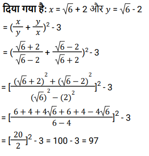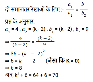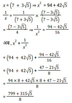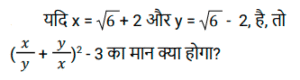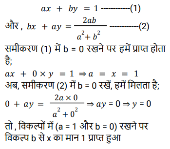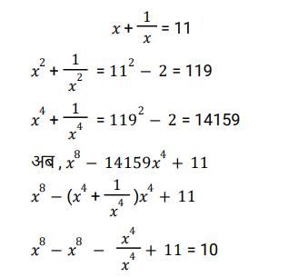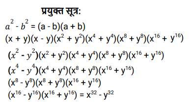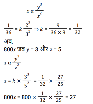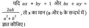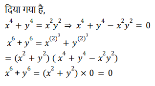 बीजगणित (SSC)Total Questions: 501. दिए गए प्रश्न का उत्तर ज्ञात कीजिए ? [SSC CGL 26/09/2024 (2nd Shift)](a) 42(b) 97(c) 35(d) 22Correct Answer: (b) 97Solution:2. x', 'y' के घन के अनुक्रमानुपाती और 'z' के वर्गके व्युत्क्रमानुपाती है। यदि y = 2 और z = 3 होने पर x = 1/36 है, तो y = 3 और z = 5 होने पर 800x का मान क्या होगा? [SSC CGL 25/09/2024 (3rd Shift)](a) 9/800(b) 27(c) 800/9(d) 9Correct Answer: (b) 27Solution:3. यदि 0.4x + 0.16y = 1.7 और 0.3x + 0.12y = 3.4 है, तो निम्नलिखित में से कौन सा कथन सही है? [SSC CGL 11/09/2024 (2nd Shift)](a) निकाय में परिमित रूप सेअनेक हल हैं लेकिन अद्वितीय नहीं हैं।(b) निकाय के अपरिमित रूप से अनेक हल हैं।(c) निकाय का कोई हल नहीं है।(d) निकाय का अद्वितीय हल है।Correct Answer: (c) निकाय का कोई हल नहीं है।Solution:4. यदि समीकरण 4x + (k − 2)y + 3 = 0 और (k − 2)x + 9y − 5 = 0 (k > 0) समांतर हैं, तो k² + 6 का मान ज्ञात करें। [SSC CGL 09/09/2024 (3rd Shift)](a) 68(b) 70(c) 72(d) 64Correct Answer: (b) 70Solution:5. यदि बहुपद (2𝓍³ + a𝓍² + 3𝓍 - 5) और(𝓍³ + 𝓍² - 2𝓍 + a) को (𝑥 - 2) से विभाजित करने पर समान शेषफल प्राप्त होता है, तो शेषफल ज्ञात करें। [SSC CPO 28/06/2024 (3rd Shift)](a) 4(b) 3(c) 2(d) 5Correct Answer: (d) 5Solution:6. निम्नलिखित व्यंजक को सरल कीजिए: (x + y) (x - y) (x² + y²) (x⁴ + y⁴) (x⁸ + y⁸) (x¹⁶ + y¹⁶) [Graduate Level 26/06/2024 (Shift - 3)](a) x³² - y³²(b) x¹²⁸ - y¹²⁸(c) x⁶⁴ - y⁶⁴(d) x²⁵⁶ - y²⁸Correct Answer: (a) x³² - y³²Solution:7. यदि 𝓍⁴ + y⁴ = 𝓍² y² है, तो 𝓍⁶ + y⁶ का मान क्या होगा ? [SSC CPO 04/10/2023 (1st Shift)](a) 1(b) 3(c) 2(d) 0Correct Answer: (d) 0Solution:8. दिए गए प्रश्न का उत्तर ज्ञात कीजिए ? [SSC CHSL 11/08/2023 (4th Shift)](a)(b)(c)(d)Correct Answer: (b)Solution:9. दिए गए प्रश्न का उत्तर ज्ञात कीजिए ? [SSC CHSL 09/08/2023 (4th Shift)](a)(b)(c)(d)Correct Answer: (d)Solution:10. यदि x² - 11x + 1 = 0, तो x⁸ - 14159x⁴ + 11 का मान क्या है? [SSC CHSL 08/08/2023 (1st Shift)](a) 9(b) 10(c) 12(d) 11Correct Answer: (b) 10Solution:Submit Quiz12345Next »