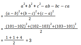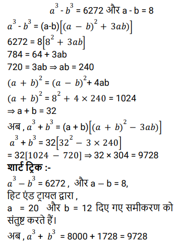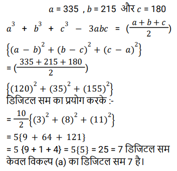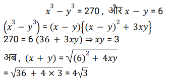 बीजगणित (SSC)Total Questions: 5011. सरल कीजिए : [SSC CHSL 07/08/2023 (3rd Shift)](a) 1/2(b) 2/3(c) 3/2(d) 1/4Correct Answer: (d) 1/4Solution:12. k के किस धनात्मक मान के लिए, समीकरण 3x² + 2kx + 3 = 0 के वास्तविक और बराबर मूल हैं ? [SSC CHSL 07/08/2023 (2nd Shift)](a) 12(b) 1(c) 3(d) 9Correct Answer: (c) 3Solution:13. निम्नलिखित व्यंजक को सरल कीजिए। [SSC CHSL 04/08/2023 (4th Shift)](a) 3a²(b) 4a²(c) 5a²(d) 2a²Correct Answer: (b) 4a²Solution:14. (a³ + b³ + c³- 3abc), का मान ज्ञात कीजिए, जहां a = 335, b = 215 और c = 180. [SSC CHSL 04/08/2023 (3rd Shift)](a) 14472250(b) 15421320(c) 14502230(d) 15452630Correct Answer: (a) 14472250Solution:15. निम्नलिखित व्यंजक को सरल कीजिए। [SSC CHSL 04/08/2023 (1st Shift)](a)(b)(c)(d)Correct Answer: (a)Solution:16. यदि x³ = 270 + y³ तथा x = (6 + y ), तो (x + y ) का मान क्या है? (यदि x > 0 और y > 0 ) [SSC CHSL 03/08/2023 (4th Shift)](a) 2√3(b) √3(c) 4√3(d) 4√2Correct Answer: (c) 4√3Solution:17. यदि p + q + r = 0 , तो निम्नलिखित व्यंजक का सरलीकृत मान क्या है ? [SSC CHSL 03/08/2023 (2nd Shift)](a) 0(b) 2(c) 1(d) -1Correct Answer: (b) 2Solution:18. दिए गए प्रश्न का उत्तर ज्ञात कीजिए ? [SSC CHSL 02/08/2023 (2nd Shift)](a) 22970√23(b) 23030√23(c) 23060√23(d) 22960√23Correct Answer: (b) 23030√23Solution:19. किन्हीं दो प्राकृत संख्याओं के घनों का अंतर 6272 है, जबकि दी गई दोनों संख्याओं का धनात्मक अंतर 8 है। दी गई दोनों संख्याओं के घनों का योग क्या होगा? [SSC CGL 27/07/2023 (1st shift)](a) 9728(b) 9684(c) 8000(d) 9600Correct Answer: (a) 9728Solution:20. यदि a = 101, b = 102 और c = 103 है, तो a² + b² + c² - ab - bc - ca का मान क्या होगा? [SSC CGL 24/07/2023 (1st shift)](a) 2(b) 4(c) 3(d) 6Correct Answer: (c) 3Solution:Submit Quiz« Previous12345Next »