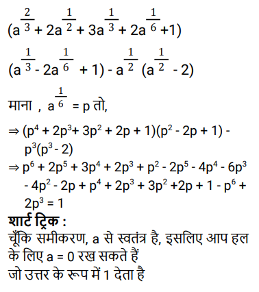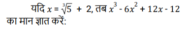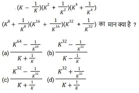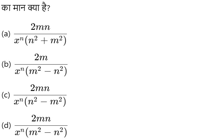 बीजगणित (SSC)Total Questions: 5031. दिए गए प्रश्न का उत्तर ज्ञात कीजिए ? [SSC CGL 06/12/2022 (3rd Shift)](a)(b)(c)(d)Correct Answer: (a)Solution:32. निम्नलिखित मेंसेकौन सा कथन सही है ? [SSC CGL 02/12/2022 (4th Shift)](a) केवल ।(b) केवल ॥(c) । तथा II दोनों(d) ना ही । ना ही ।ICorrect Answer: (a) केवल ।Solution:33. दिए गए प्रश्न का उत्तर ज्ञात कीजिए ? [SSC CHSL 24/05/2022 (Morning)](a)(b)(c)(d)Correct Answer: (c)Solution:34. a² + b² = 25, 𝓍² + y² = 17 और ax + by = 8 तो (ay - bx) का मान है: [SSC CHSL 13/4/2021 (Afternoon)](a) 33(b) 25(d) 19(c) 21Correct Answer: (d) 19Solution:35. दिए गए प्रश्न का उत्तर ज्ञात कीजिए ? [SSC CGL Tier II (18/11/2020)](a) 14/13(b) 1(c) 15/13(d) 13/15Correct Answer: (c) 15/13Solution:36. यदि x³ + 2x² - ax - b , (x² - 1) से संपूर्ण विभाज्य है, तो a और b के मान ज्ञात करें | [SSC CHSL 21/10/2020 (Afternoon)](a) a = -1, and b = 2(b) a = 1 and b = -2(c) a = 1 and b = 2(d) a = 2 and b = 2Correct Answer: (c) a = 1 and b = 2Solution:37. दिए गए प्रश्न का उत्तर ज्ञात कीजिए ? [SSC CHSL 21/10/2020 (Morning)](a) 0(b) 2(c) 1(d) - 1Correct Answer: (c) 1Solution:38. (ax + by) किसका एक गुणनखण्ड है: [SSC CHSL 16/10/2020 (Afternoon)](a) a²x² + 2ab - b²y²(b) a²x² + 2abxy + b²y²(c) a²x³+ 2abx + b²y²x(d) a²x² + 2ab + b²y²Correct Answer: (b) a²x² + 2abxy + b²y²Solution:39. अगर a एक प्राकृतिक संख्या है, तो (7a² + 7a) हमेशा विभाजित होगी : [SSC CHSL 16/10/2020 (Morning)](a) 7 और 14 दोनों(b) 7 केवल(c) 14 केवल(d) 21 केवलCorrect Answer: (a) 7 और 14 दोनोंSolution:40. दिए गए प्रश्न का उत्तर ज्ञात कीजिए ? [SSC CHSL 13/10/2020 (Morning)](a) 7(b) 0(c) 1(d) √7Correct Answer: (c) 1Solution:Submit Quiz« Previous12345Next »